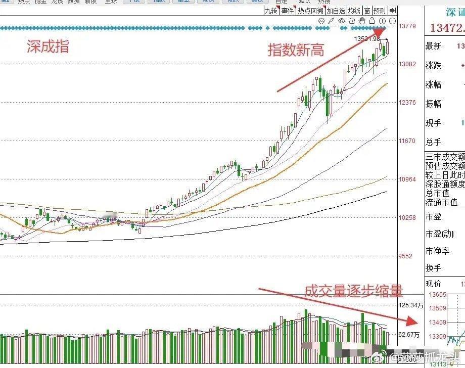第二搜从深成指创业板指的角度来考虑深成指创业板指目前日线级别五浪结构特别的清晰,并且日线级别量能顶背离,rsi指标顶背离结构也非常的清晰。在这种情况下,虽然今天出现了反包的走势,但是今天的成交量比上一个交易日还要小一些(大家请看图二)。今天的上涨,目前来说还是没有得到成交量的跟随。虽然有长假因素,但是这个位置我们还是得考虑到成交量的问题。