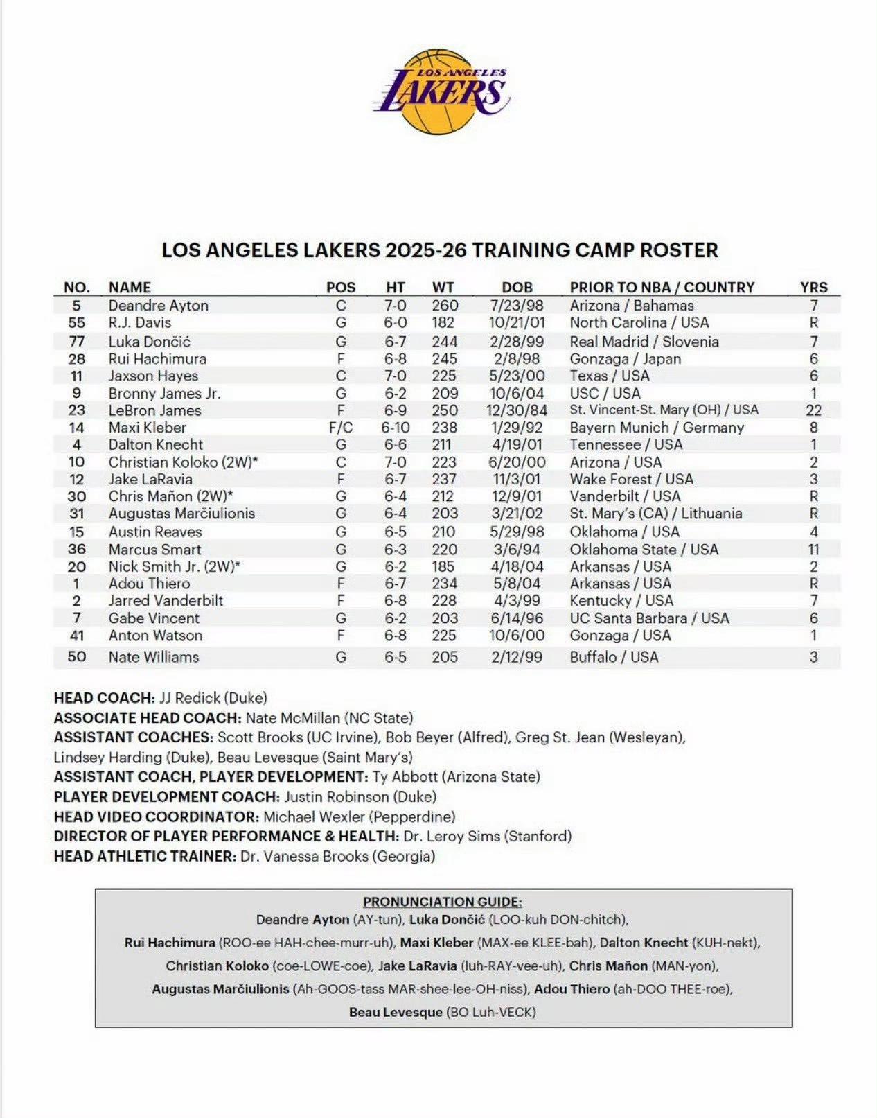 湖人训练营大名单:东詹里领衔,总共21名球员,14位正式合同球员,3位双向合同球