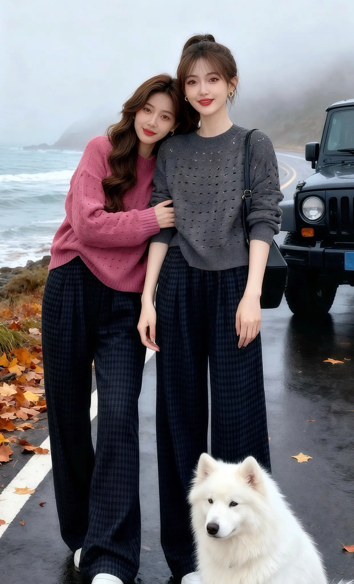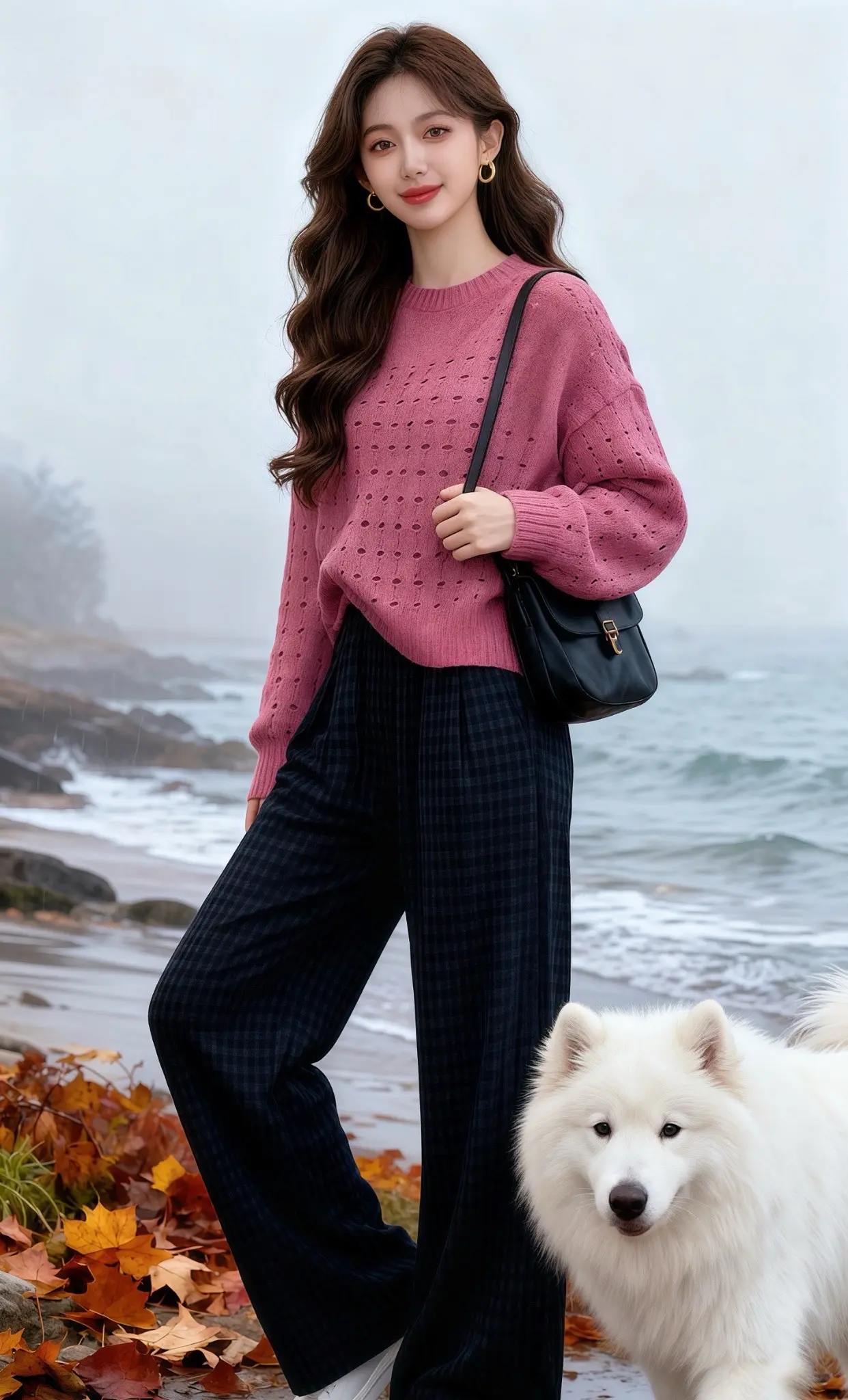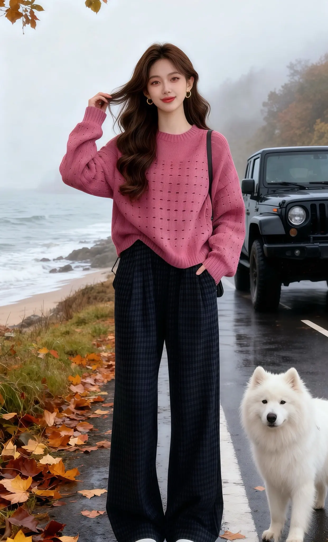 并肩站在公路边时,苏郁的灰色针织衫与她的粉色形成温柔碰撞。海风吹乱头发,林溪抬手捋发的瞬间,“雪球”亲昵地蹭着她的裤腿。她们踩着落叶走到海边,礁石上还挂着雨后的湿润,针织衫的镂空纹理在雾色里透着随性的精致。