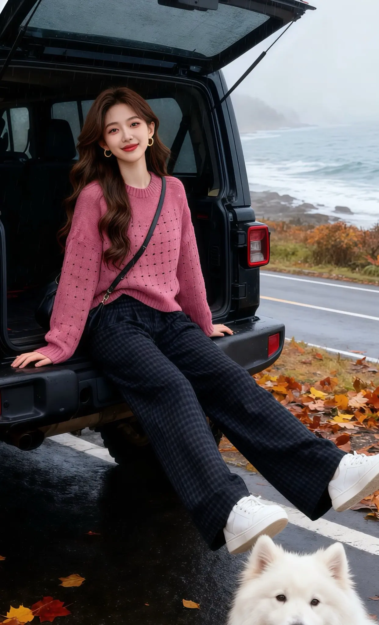 深秋的海岸公路,雾气将海浪揉成朦胧的白。林溪坐在越野车后备箱,粉色针织衫被风掀起一角,萨摩耶“雪球”在脚边摇着尾巴。她和闺蜜苏郁约好来这场海岸之旅,只为在忙碌生活里偷得半日闲。