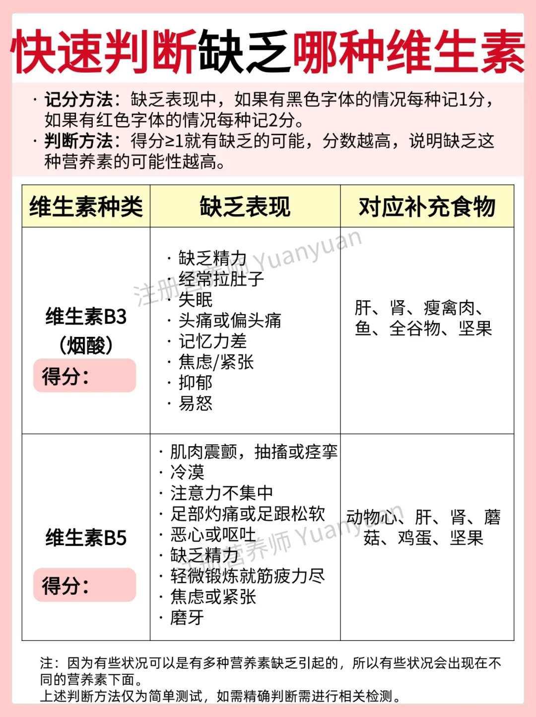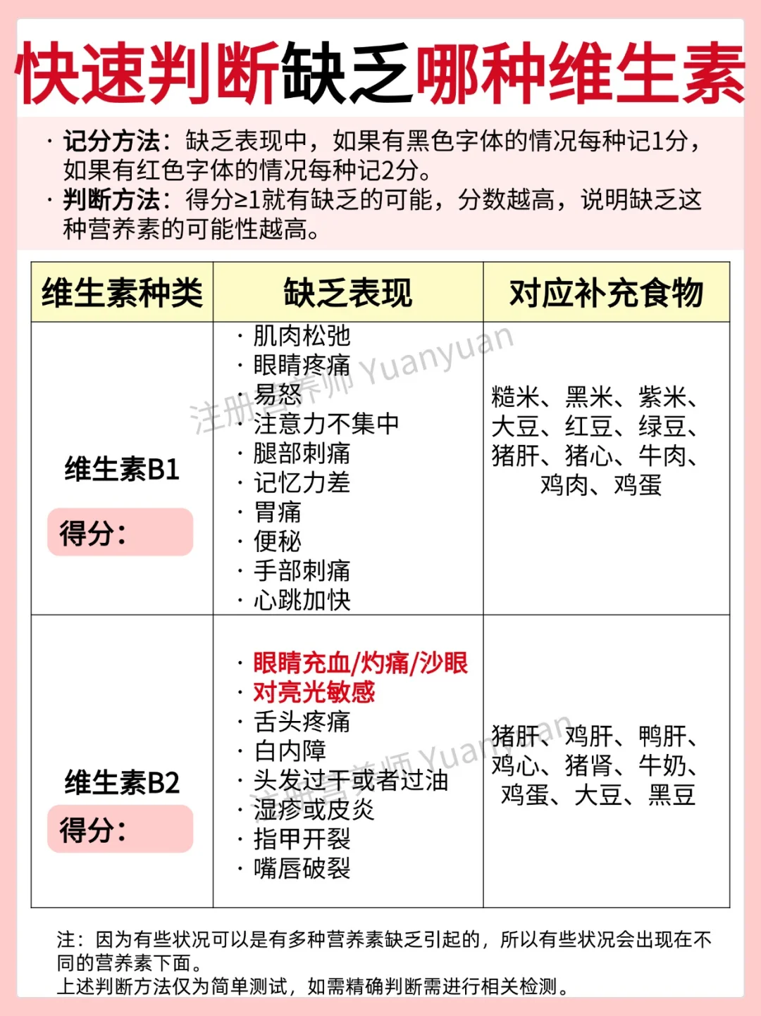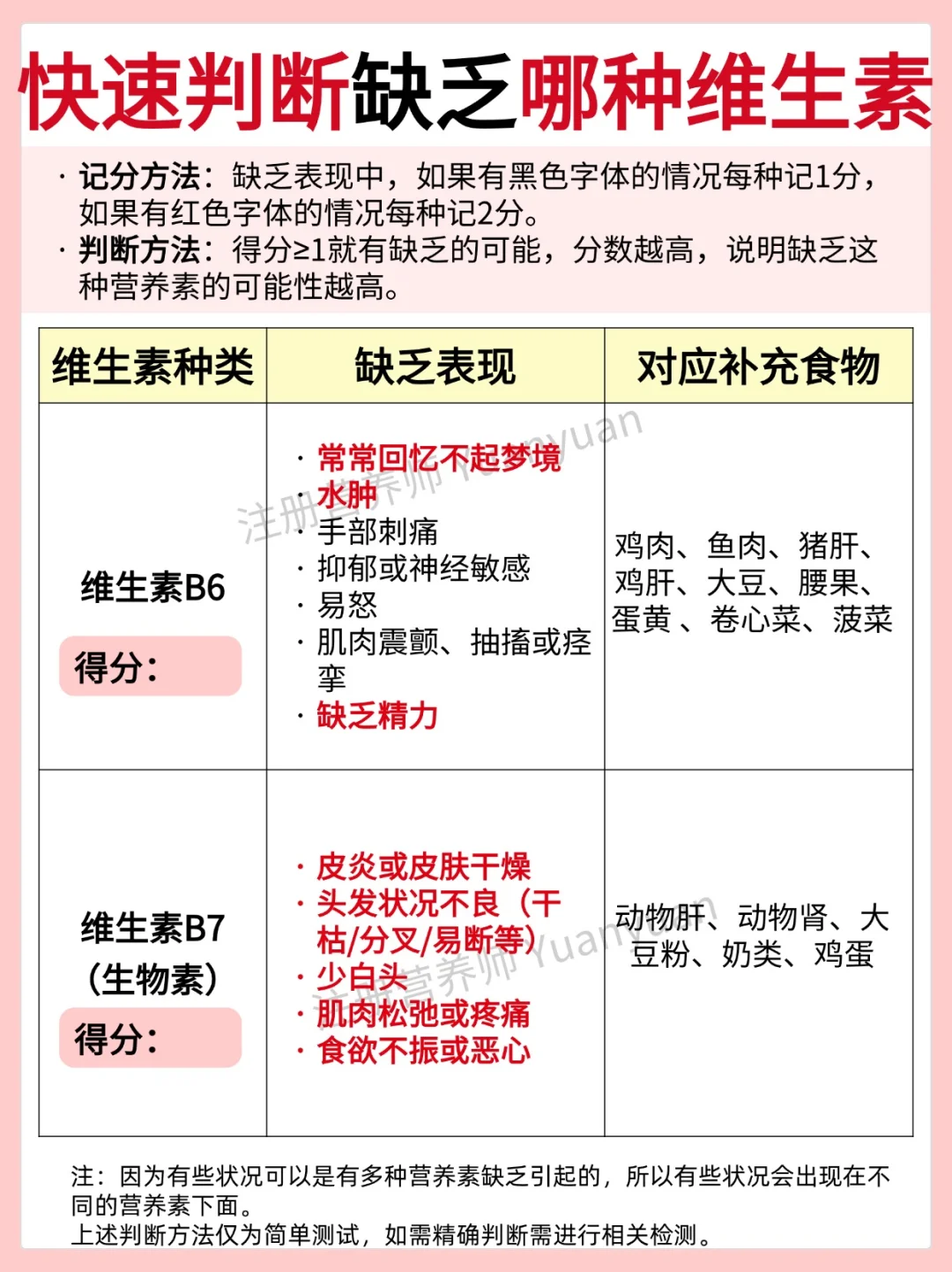 维生素和矿物质等在适合的时间补充,吸收更好。单一维生素和常见矿物质的适宜补充时间见图1。 1天为例,如果吃的营养补剂较多,可以从参考以下时间表 ⏰早餐前 B族维生素、膳食纤维 ⚠️空腹肠胃不适可以随餐/餐后 ⏰早餐后 VA、VE、鱼油 辅酶Q10 DHA、复合维生素 ⏰早餐-午餐之间 铁,VC ⚠️空腹吃铁肠胃不适的可以随餐/餐后 ⏰午餐后 虾青素、叶黄素、 氨糖软骨素、锌、VD ⏰晚餐后/睡前2小时 钙、镁 ⏰睡前30-60分钟 GABA、褪黑素 ⏰睡前 胶原蛋白肽 📢 📢 📢敲黑板,划重点 一般不会同时吃这么多营养补充剂。上方的时间表只是一个相对比较合适的服用安排。仅做参考,可根据自己实际情况调整。 ------------------- 另外,回复大家常见问题 📌服用B族维生素,尿液发黄是正常现象,因为VB2是黄色的会随尿液排出。 📌如果服用大量VD,不建议晚上服用,因为会影响褪黑素的分泌,可能会影响睡眠。 📌复合维生素,建议早餐后吃。 另外,图2-图6为简单判断自己是否缺乏某种维生素方法,仅供参考,需精确判断需进行相关检测。如有不适即使就yi。 营养师朋友已在线营养素维生素补充全攻略维生素服用时间维生素