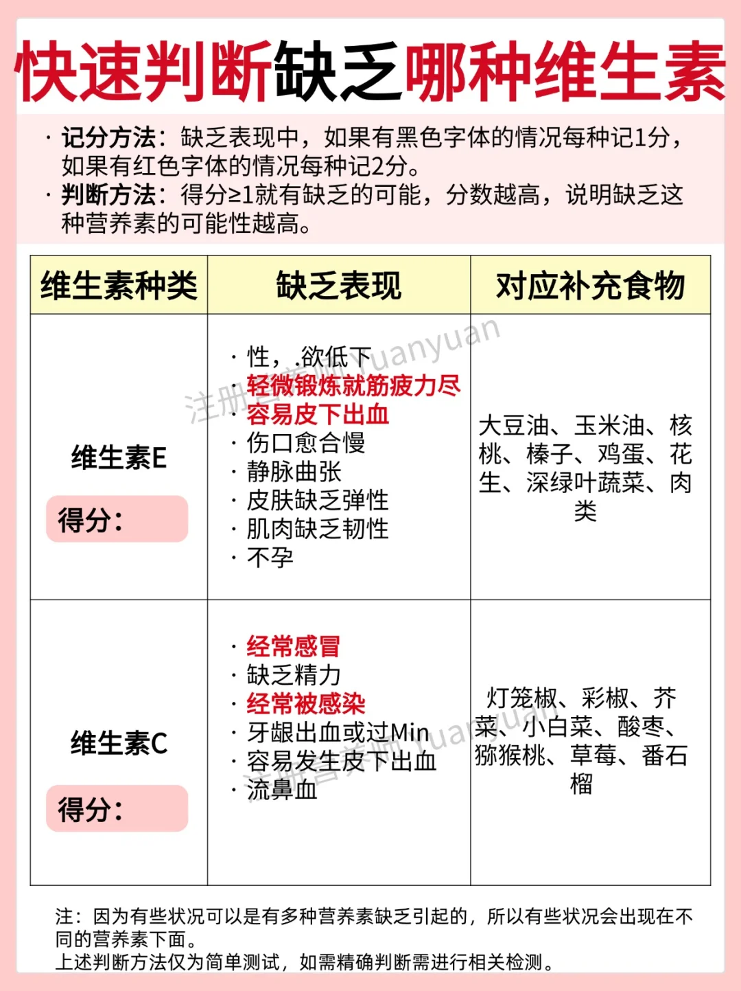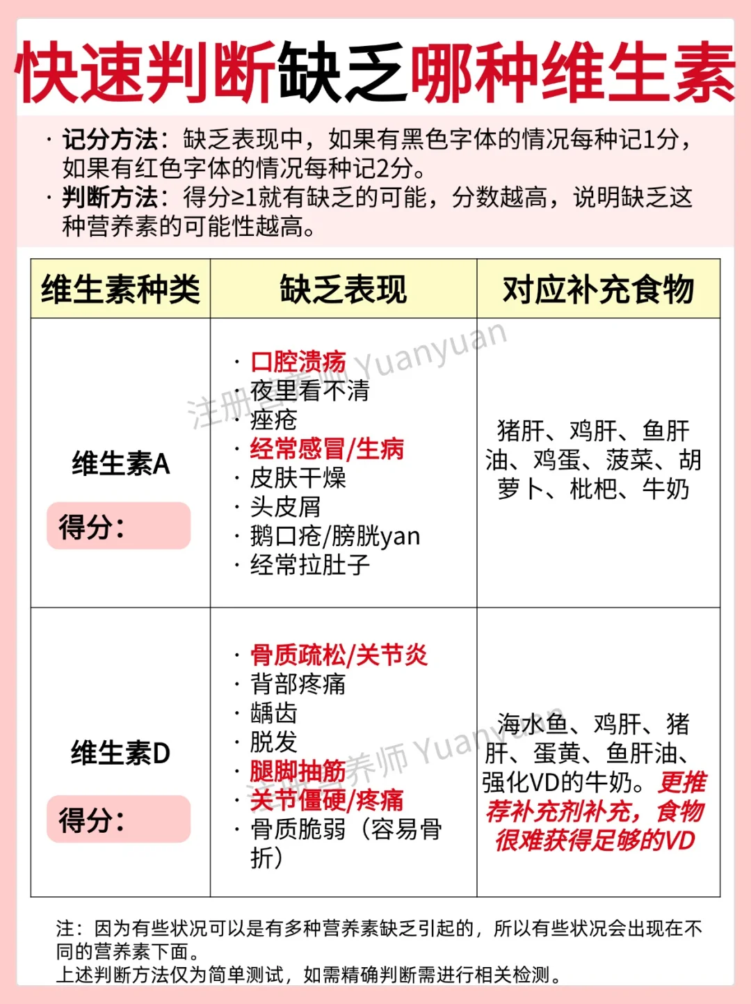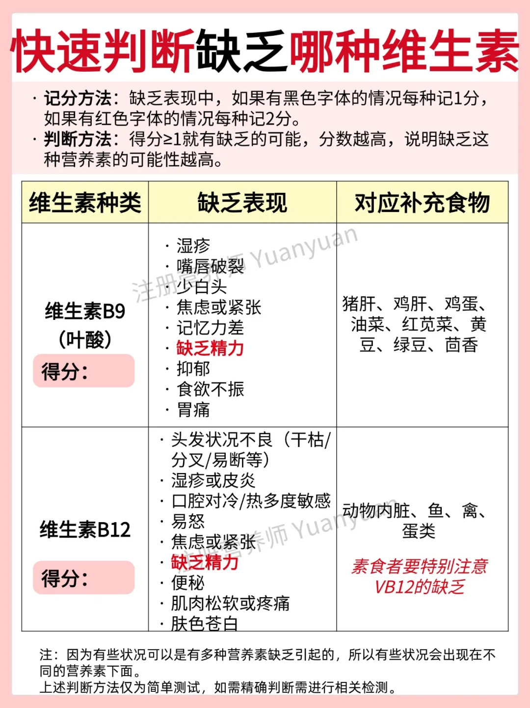 维生素和矿物质等在适合的时间补充,吸收更好。单一维生素和常见矿物质的适宜补充时间见图1。 1天为例,如果吃的营养补剂较多,可以从参考以下时间表 ⏰早餐前 B族维生素、膳食纤维 ⚠️空腹肠胃不适可以随餐/餐后 ⏰早餐后 VA、VE、鱼油 辅酶Q10 DHA、复合维生素 ⏰早餐-午餐之间 铁,VC ⚠️空腹吃铁肠胃不适的可以随餐/餐后 ⏰午餐后 虾青素、叶黄素、 氨糖软骨素、锌、VD ⏰晚餐后/睡前2小时 钙、镁 ⏰睡前30-60分钟 GABA、褪黑素 ⏰睡前 胶原蛋白肽 📢 📢 📢敲黑板,划重点 一般不会同时吃这么多营养补充剂。上方的时间表只是一个相对比较合适的服用安排。仅做参考,可根据自己实际情况调整。 ------------------- 另外,回复大家常见问题 📌服用B族维生素,尿液发黄是正常现象,因为VB2是黄色的会随尿液排出。 📌如果服用大量VD,不建议晚上服用,因为会影响褪黑素的分泌,可能会影响睡眠。 📌复合维生素,建议早餐后吃。 另外,图2-图6为简单判断自己是否缺乏某种维生素方法,仅供参考,需精确判断需进行相关检测。如有不适即使就yi。 营养师朋友已在线营养素维生素补充全攻略维生素服用时间维生素