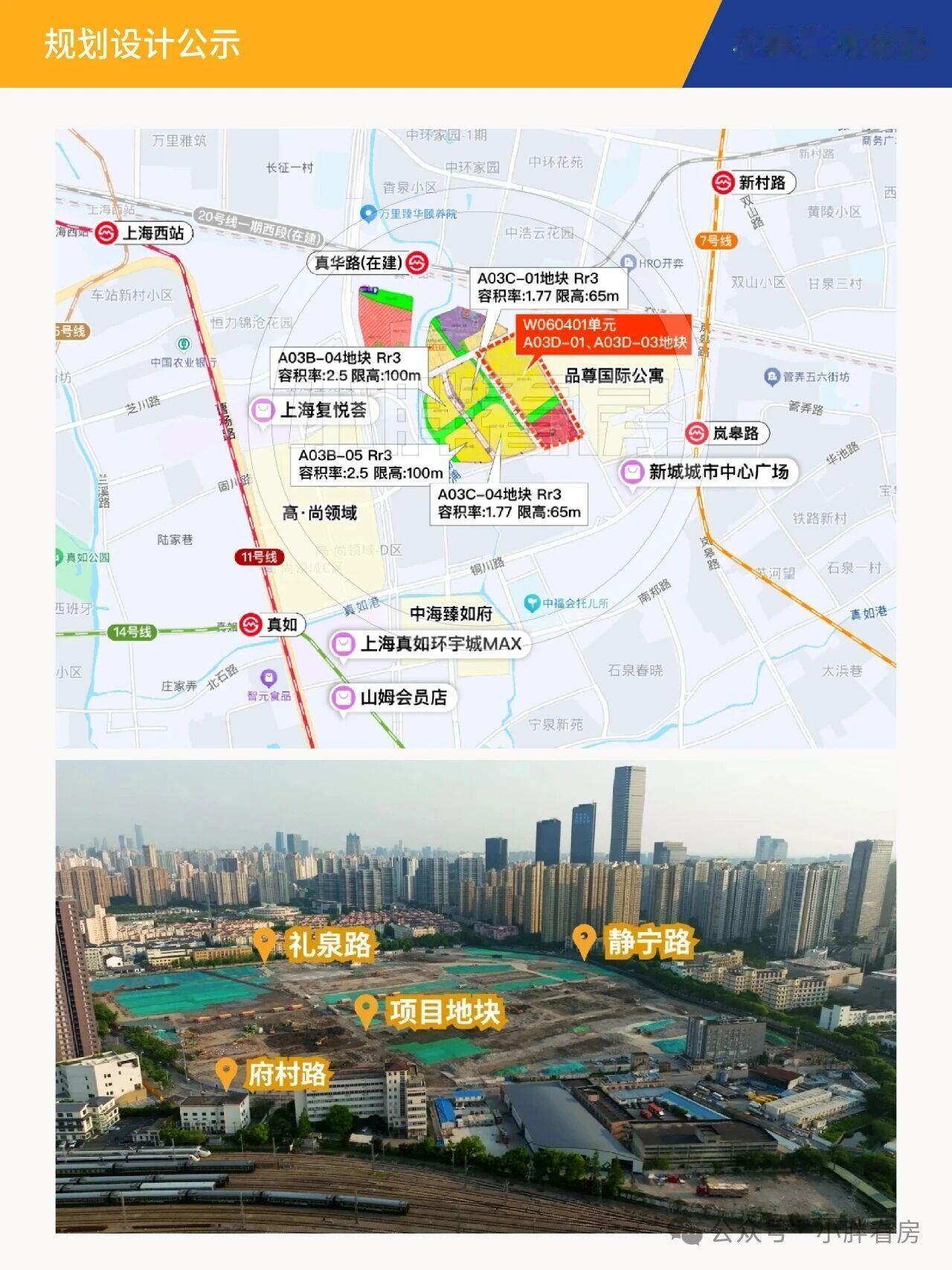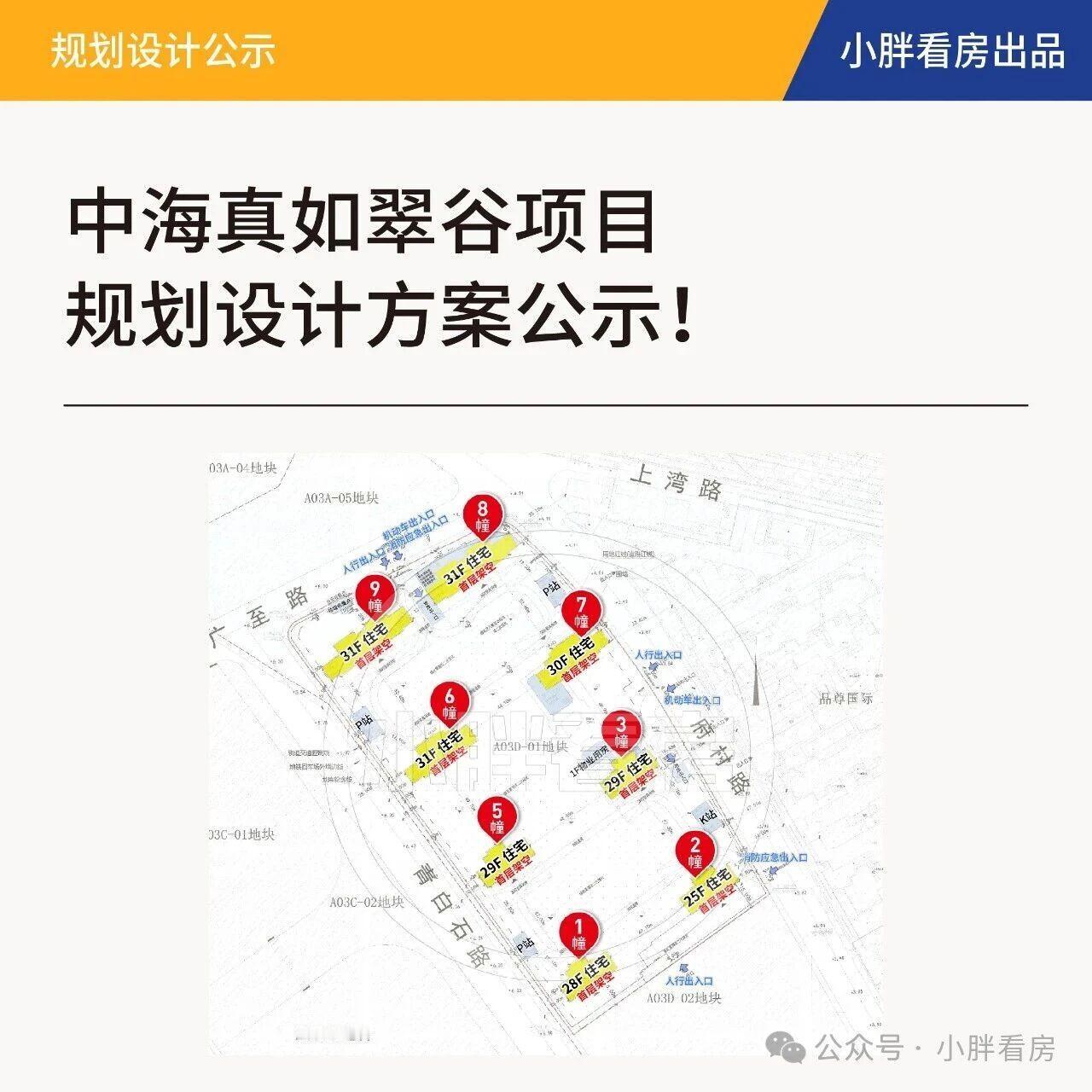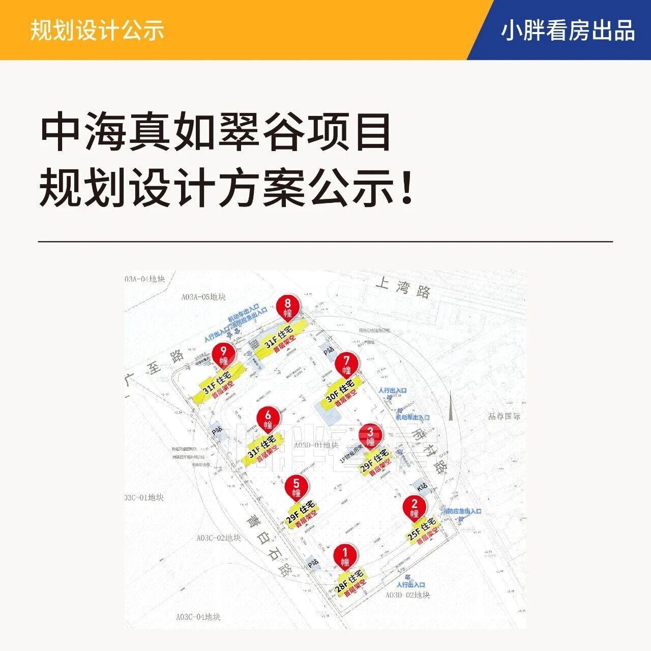 中海真如翠谷项目规划设计方案公示! 最新爆料!中海真如翠谷项目——普陀区W060401单元A03D-01地块规划方案公示! 根据设计方案,项目拟建8栋25-31F住宅产品,并且全部做了首层架空! 用地范围:东至府村路,西至青白石路,北至广至路 出入口数量:3个人行出入口,2个车行出入口。 住宅楼栋数:8栋 住宅层数:25-31层,首层架空。 容积率:2.5 住宅建筑高度:86-100米 景观:三个大景观组团 7月24日,上海六批次土拍中,中海地产以总价652500万元,竞得普陀区W060401单元A03D-01、A03D-03地块,成交楼板价58823元/㎡,溢价率14.17%! 其中,商品住宅成交楼面地价72380元/平方米! 本次出让地块为普陀区W060401单元A03D-01、A03D-03地块,总出让面积4.72公顷,总建筑面积11万平方米。 其中一宗为商品住宅用地,出让面积3.43公顷,容积率2.5,建筑面积8.58万平方米;另一宗为商业用地,出让面积1.29公顷,容积率1.95,建筑面积2.5万平方米。 本地块不仅是“真如翠谷”板块首发地块,也是真如城市副中心多年以来首次推出的优质地块,未来将极大满足区域内对于高品质住宅的需求。