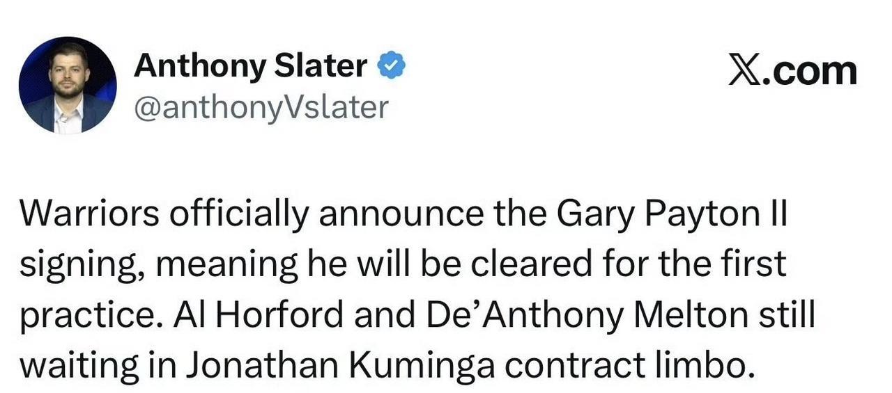 勇士正式官宣小佩顿回归! 据NBA记者Anthony Slater 报道:勇士于今日正式宣布与小佩顿完成签约,正式回归球队。