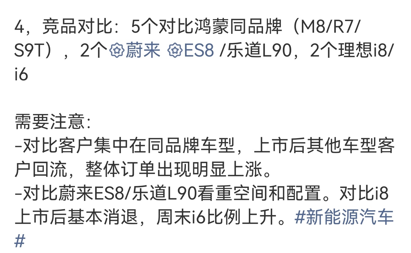 竞品对比:鸿蒙智行占5个,剩下是蔚来和理想。