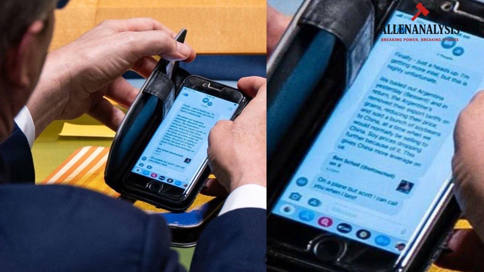 美国财政部长斯科特·贝森特在联合国总部开会时,美联社拍摄到贝森特手机照片显示,他似乎收到了来自农业部长布鲁克·罗林斯的短信。