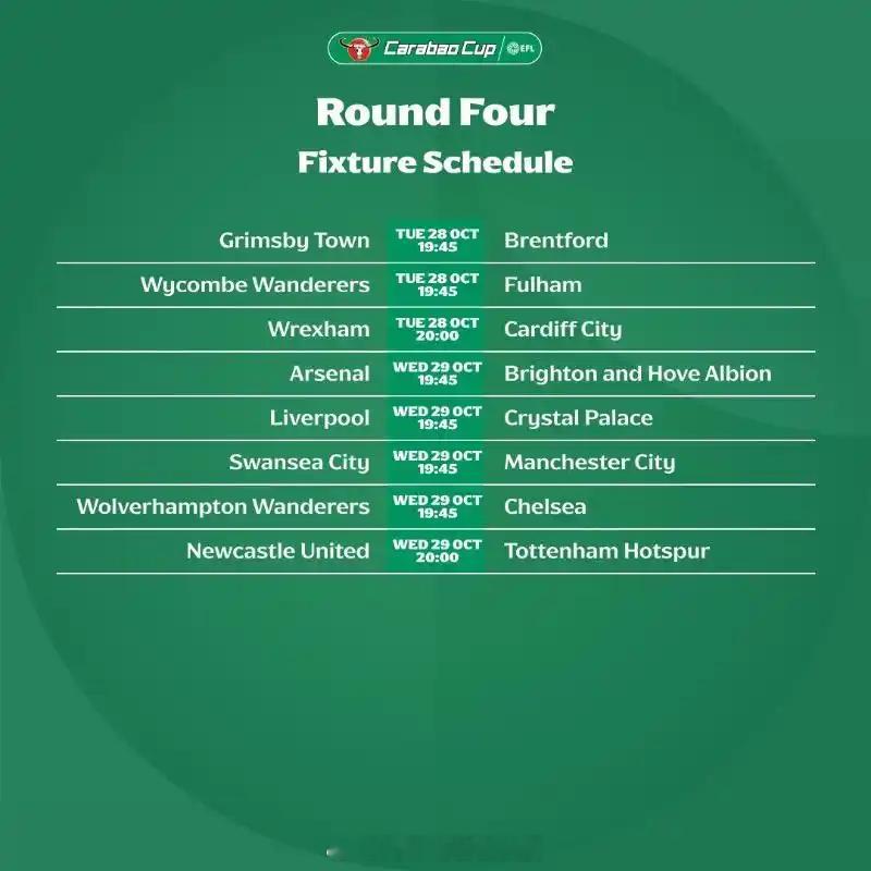 阿森纳将于10月30日星期四,在联赛杯第四轮主场迎战布莱顿,附联赛杯第四轮具体赛程(均为北京时间):