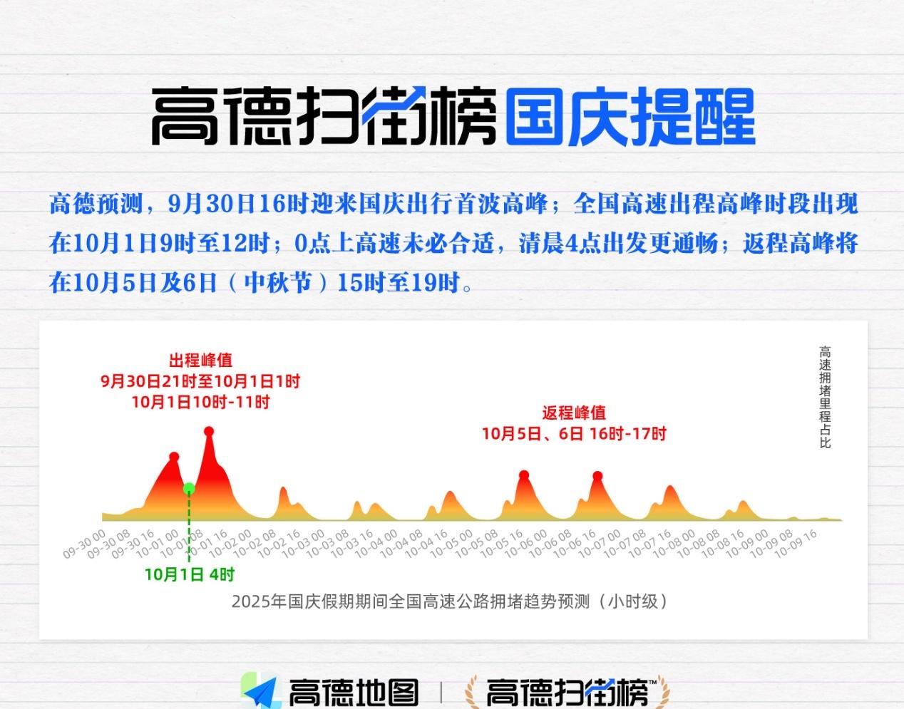 国庆出行必看!高德扫街榜发布最新预测,这些路段请绕行! 眼看着国庆长假就要到来,相信不少朋友已经收拾好行李准备出发。不过在你出发之前,这份高德扫街榜刚刚发布的出行预测可得好好看看。 根据高德扫街榜预测,今天下午4点将迎来第一波出行高峰,而明天上午9点到12点则是高速出程的最高峰时段。特别要提醒的是,往年大家都爱赶在10月1日零点上高速,但数据显示这个时间点反而会形成拥堵小高峰。想要真正避开拥堵,不妨考虑清晨4点出发,那时候路况最为理想。 从具体路段来看,长三角地区的高速压力最大。预计G1522常台高速苏州段明天平均车速可能只有7公里/小时,比自行车还慢。G2京沪高速无锡段、泰州段的情况也不容乐观。如果你计划经过这些路段,建议提前做好心理准备。 面对复杂的路况,不妨试试高德的"未来用时"功能。在进行路线规划时,点击左下角的时钟图标,就能看到未来不同时段的路况预测和预计用时,帮你找到最佳出发时间。 更要紧的是,一定要开启"鹰眼守护"功能。这就像给车装上了一双千里眼,万一前方有什么突发情况,它能提前发出预警,给你留出宝贵的反应时间。毕竟,安全永远是第一位的。 讲道理,高德正在重新定义"出行"——它早已不满足于只做导航。打开APP,你能用"扫街榜"发掘地道美食,靠团购锁定超值优惠,更能享受"鹰眼守护"带来的安全感。从路线规划到吃喝玩乐,从安全预警到优惠推荐,这个全能助手正在成为我们生活中最不可或缺的智能伙伴。 最后送上高德扫街榜一句暖心提醒:"尽量错峰出行,一定安全抵达"。毕竟,最美的风景在路上,最暖的归途是平安。
