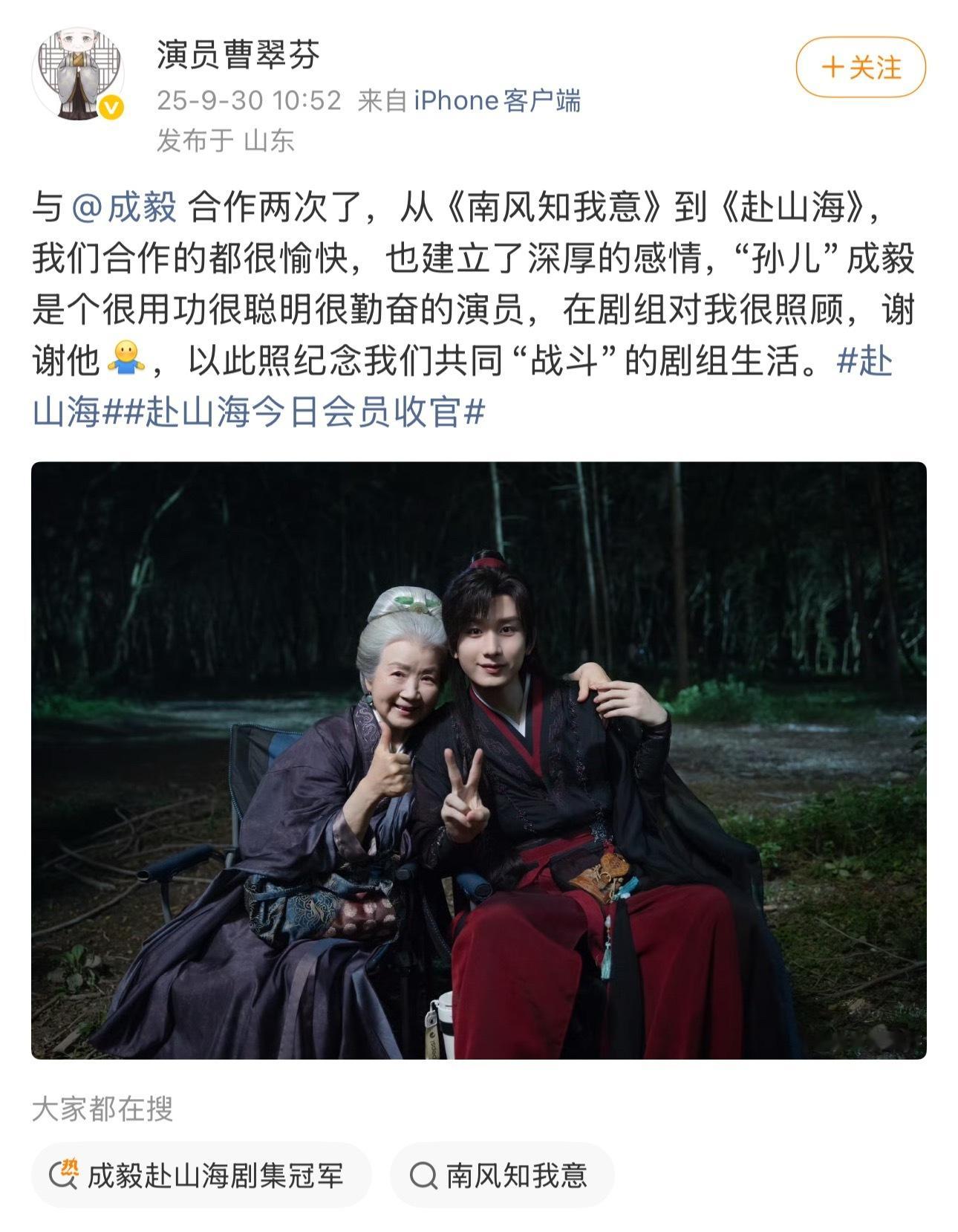 赴山海演员曹翠芬老师夸奖成毅:很用功很聪明很勤奋,对人很照顾。很真实的评价[么么