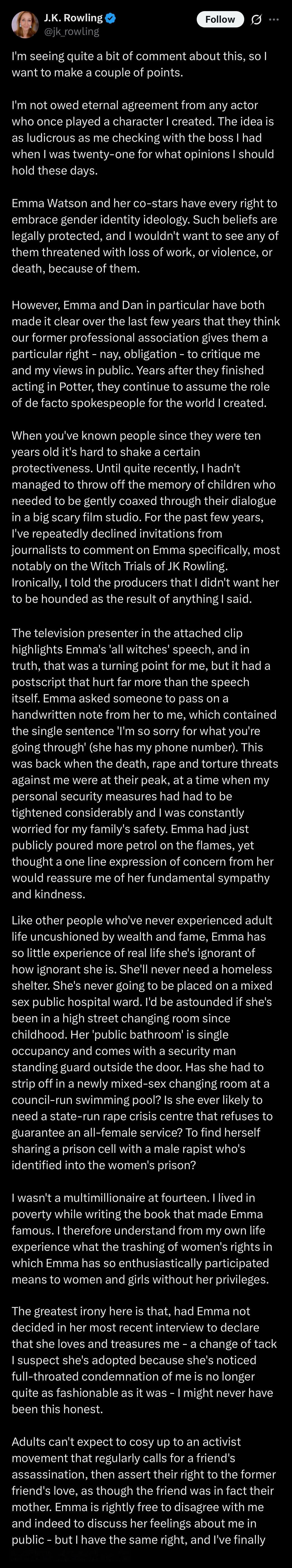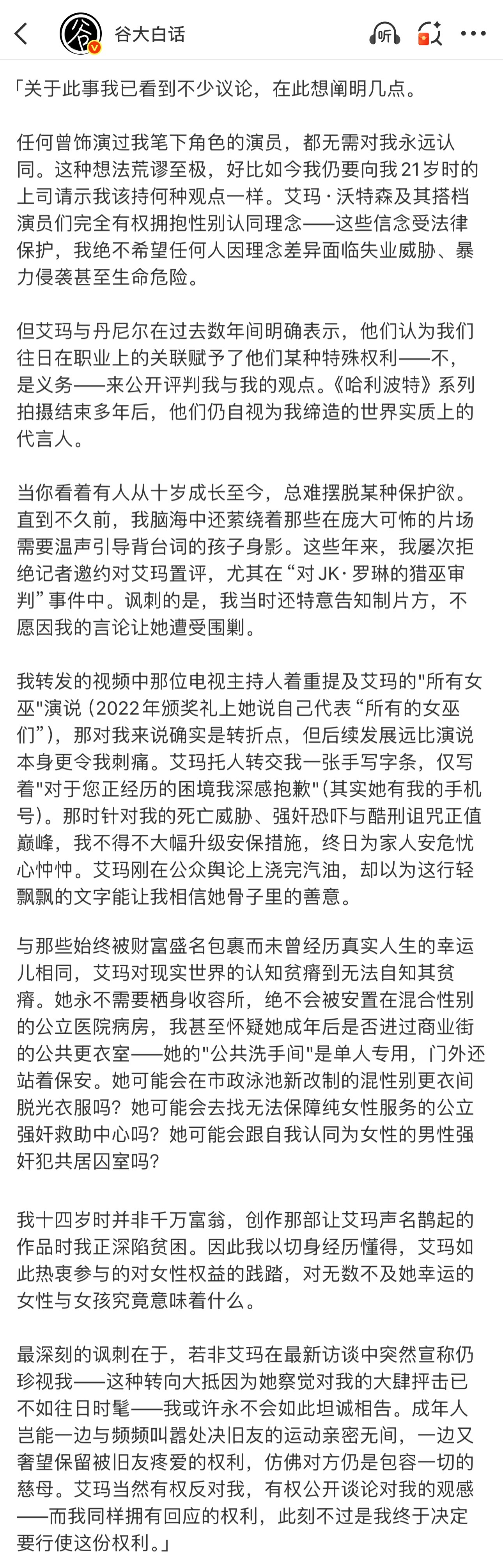 “这些年来,我屡次拒绝记者邀约对艾玛置评,尤其在“对JK•罗琳的猎巫审判”事件中。讽刺的是,我当时还特意告知制片方,不愿因我的言论让她遭受围剿。”