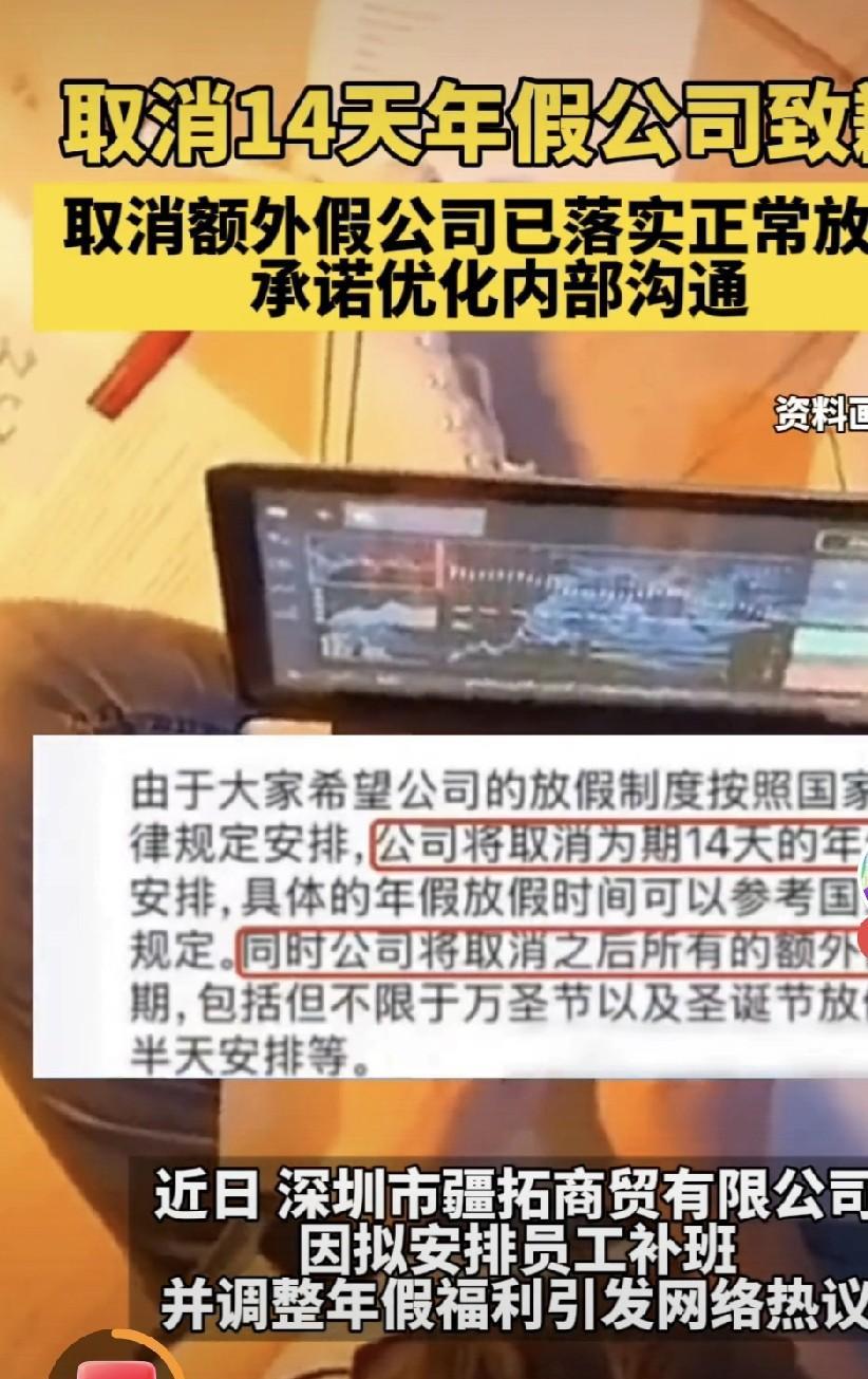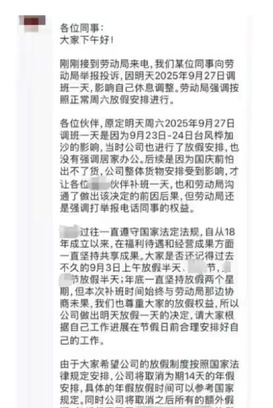 对不起,这次我站这家深圳公司。 深圳公司员工举报事件很好的反映了什么叫做一颗耗子屎坏了一锅汤。 在员工向劳动局举报后,公司很快发出了一份声明,说了事件的前因后果。 临近十一国庆,国家法定假日星期天9月28日上班即星期六休息,9月29日星期天正常正作。 这家公司因为台风影响9月23日、24日已放假两天,让员工居家休息,并且没有让员工居家办公。 因为十一国庆放假,公司担心,整体货物安排受影响,才让员工9月27号星期六也上班。 然后,公司就被某个员工举报了,说公司违背国家劳动法。劳动局就找到公司,公司承诺,星期六不再喊员工上班,按照国家法定节假日休息。 事情的来龙去脉就是这样,公司因为被员工举报寒了心,决定取消春节14天的年假。 牛马打工人都知道,春节14天年假的含金量。 正常的春节假期是几天?七天,七天能干啥?如果回异地过年,路途上的时间就要用掉一大半。 而且公司除了14天的年假,平常的节假日都是照常放的,还有些西方假日也是放了半天假的。这样的公司到哪去找? 我所在的单位是事业单位,我们就是按照国家法定节假日放假。2025年春节的时候,我们上班上到大年二十九的下午6点钟。坐在办公室里,我们如坐针毡,却又不得不继续工作。 而这家深圳公司,每年的腊月二十三就放假了,比法定假日提前一个星期放假。 不知道公司其他员工知道取消了14天的年休假,他们会怎么想? 不知道那位举报公司的员工是怎么想的?他不知道春节的国家法定节假日只有七天吗?他不知道他一年有多少节假日吗? 仅仅因为公司9月27日星期六还上班,他就去举报公司,我想他是存心不想在公司干了吧? 真是一颗耗子屎坏了一锅汤,因为他的缘故,整个公司的人都平白的少了七天的年假。
