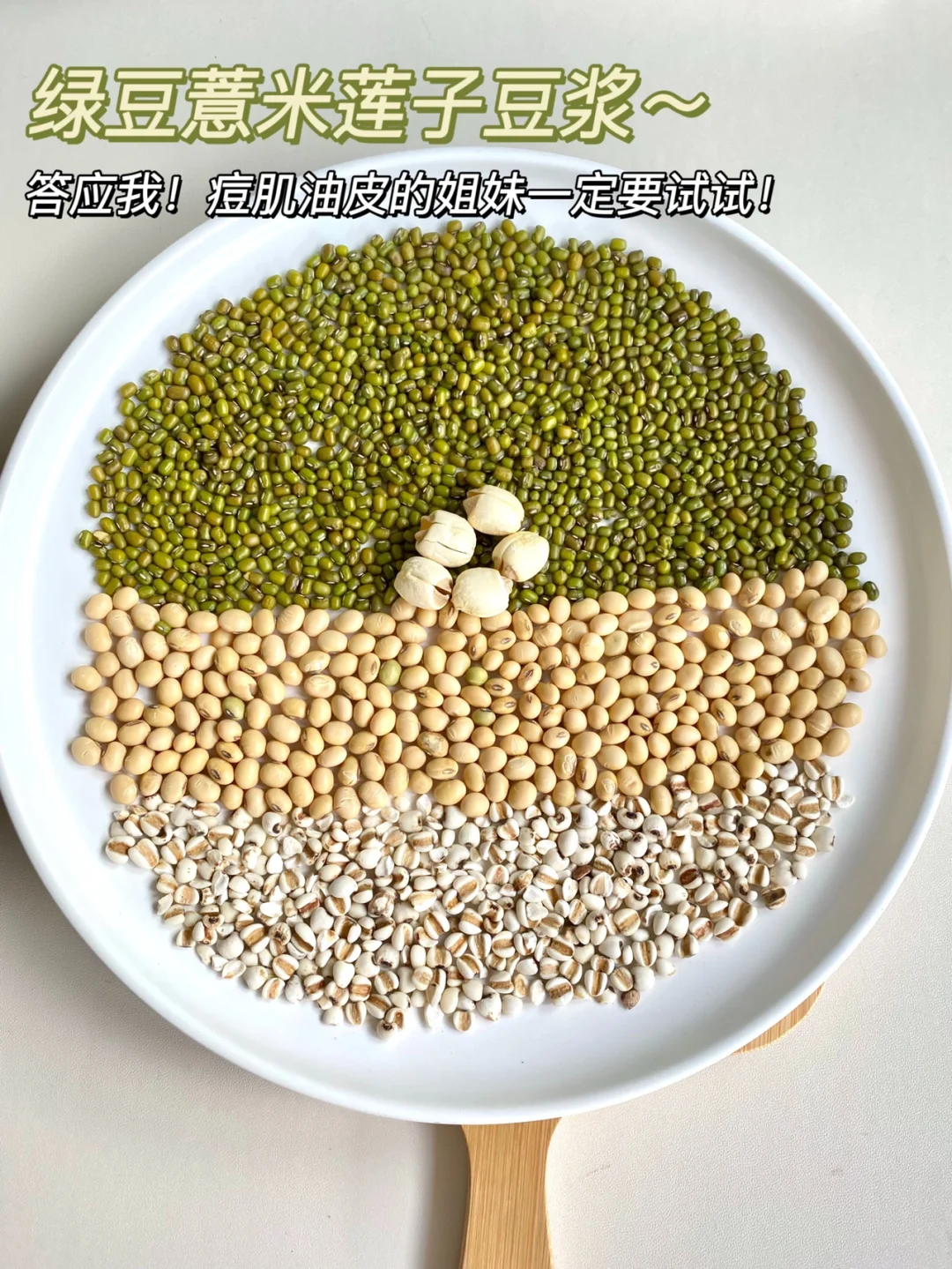 最近有好多姐妹私信我说夏天好容易出油爆痘!! 今天分享给各位姐妹这个绿豆薏米莲子豆浆~ 痘肌油皮的姐妹们可以414~ 薏米能中和肤质,抑制油脂分泌! 绿豆和莲子清热去🔥,对大油田痘肌hin友好!! 📝食材:绿豆30g➕薏米15g➕黄豆15g➕莲子5颗 ✨做法:所有食材倒入破壁机,加700ml清水,选豆浆模式即可~ ⚠️建议薏米先炒一炒,这样不凉,温和祛湿!