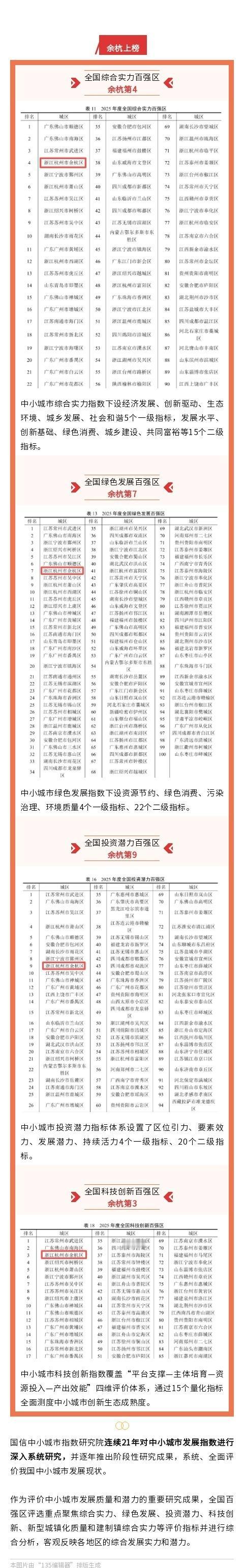 【全国百强!余杭荣登4个榜单】近日,中国中小城市发展指数研究课题组、国信中小城市