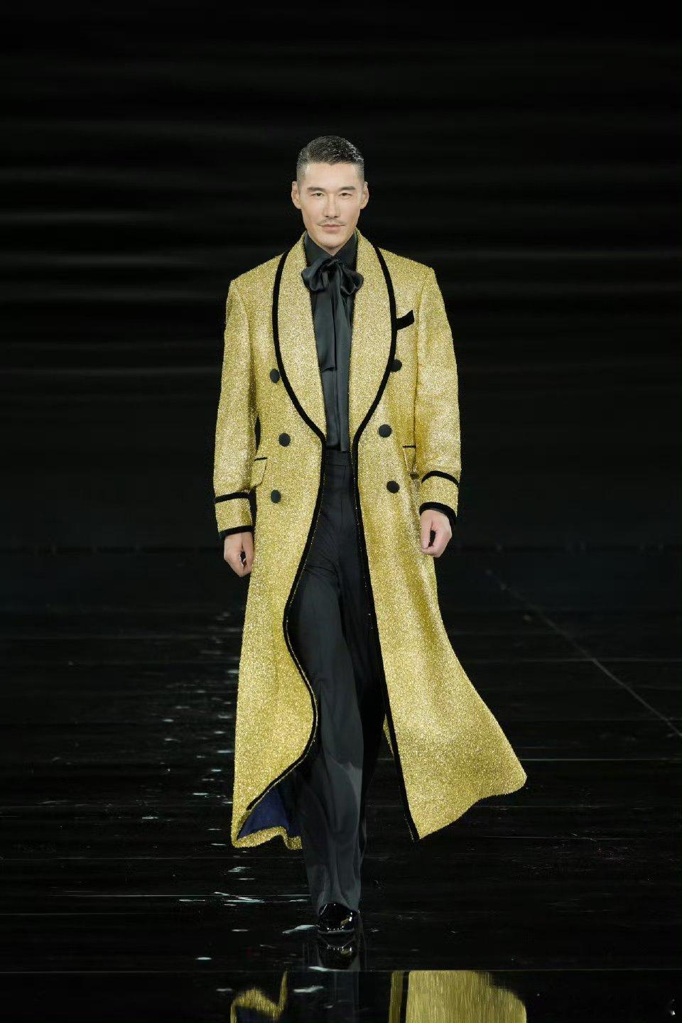 胡兵瞿颖金色战袍巴黎走秀 光影中金色战袍熠熠生辉,胡兵瞿颖的台步稳如磐石。这份跨