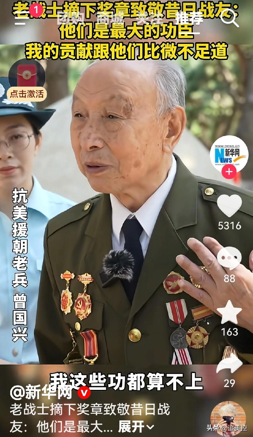 抗美援朝老战士在烈士纪念日缅怀先烈们时说要把身上佩戴的军功章都摘下,他满含深情地