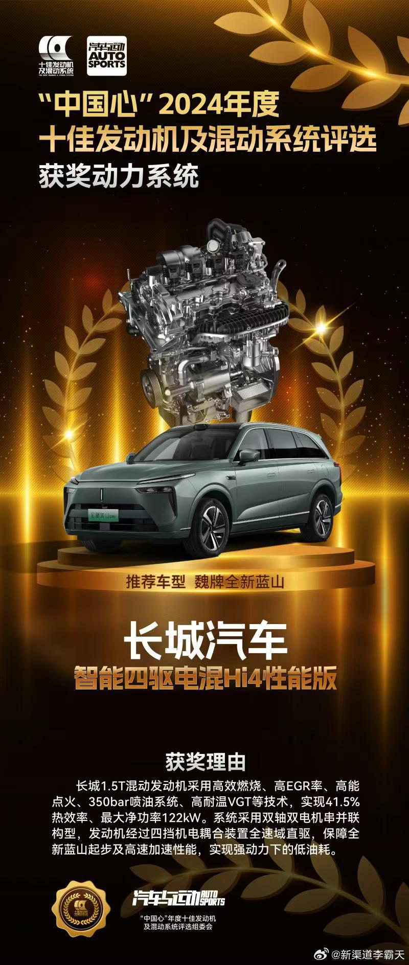 这里不得不夸一下长城汽车过于实在了,长城Hi4超级混动专用发动机工程热效率41.5%,在行业属于TOP水平,而且还是“中国心”年度十佳发动机(图2)。
