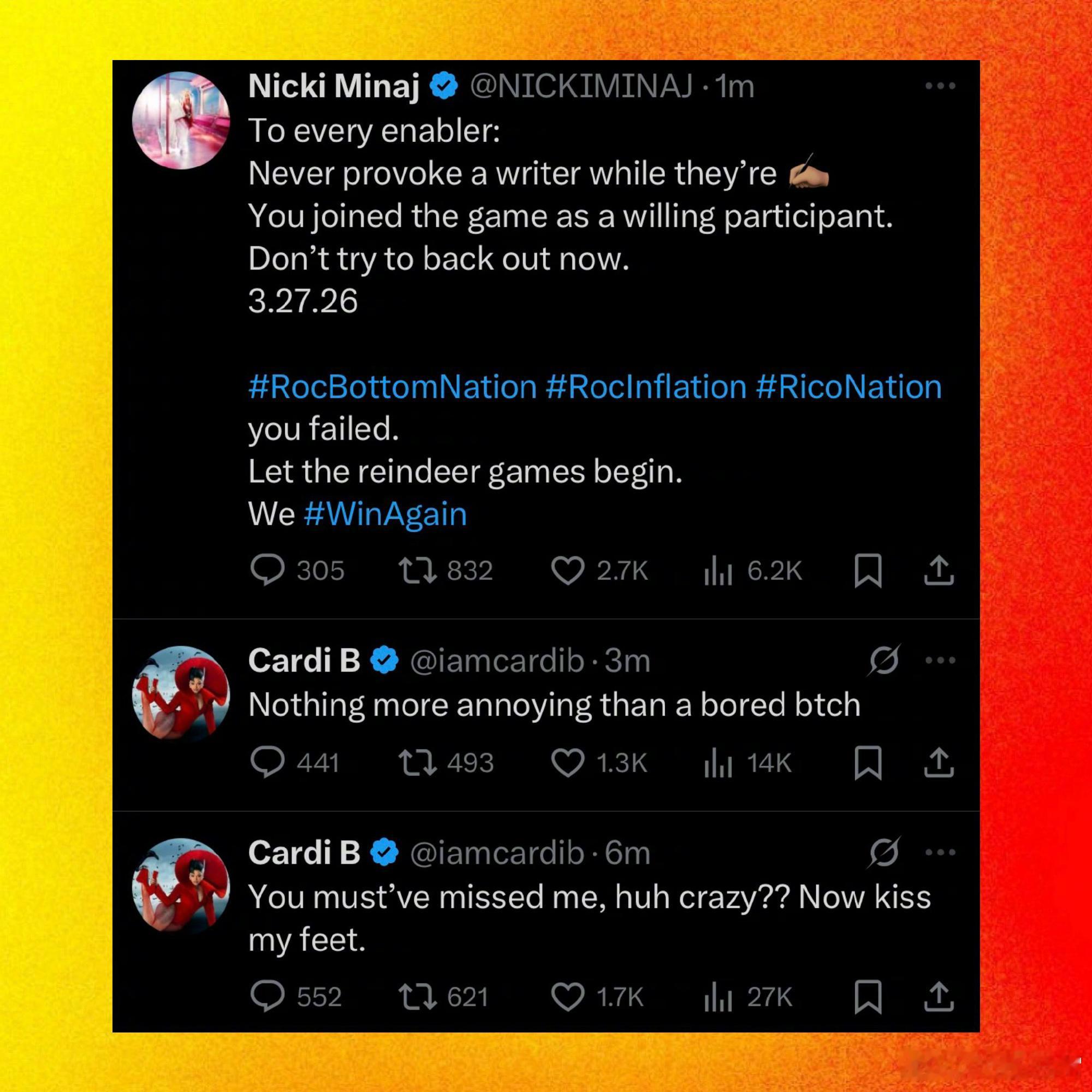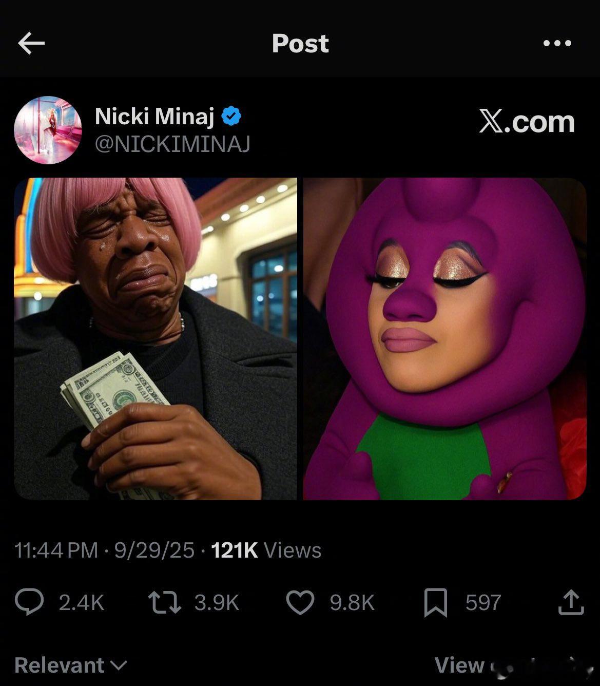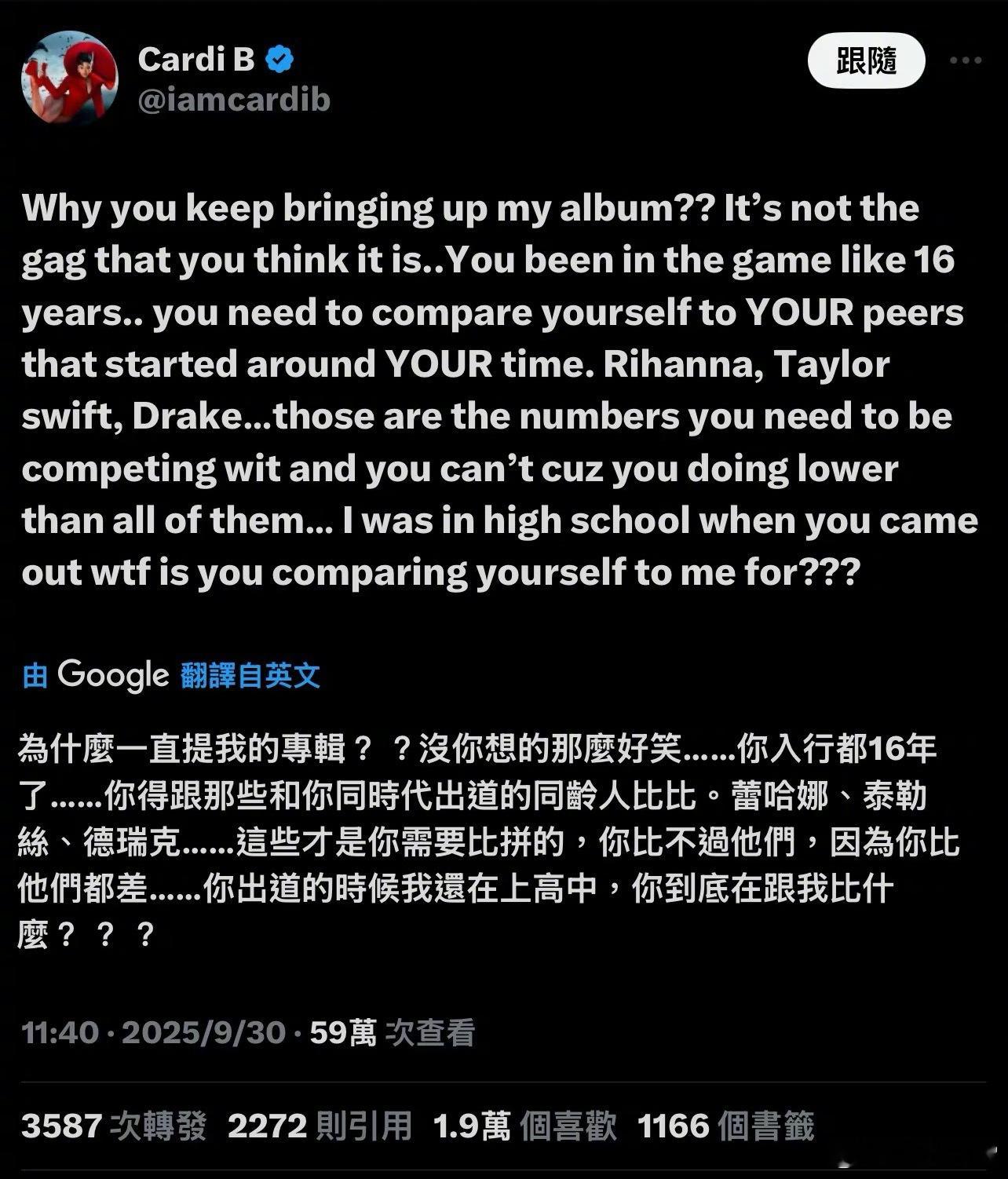 麻辣鸡和Cardi B再度开撕还互甩黑图。麻辣鸡说Cardi B新专大甩卖,Cardi B让麻辣鸡跟同期的霉霉、蕾哈娜等人比,“比不过她们因为你比她们都差, 你出道的时候我还在上高中,你到底在跟我比什么?”