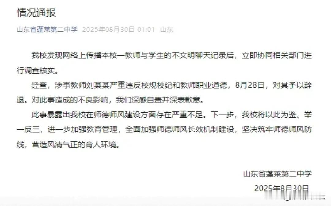 聊天记录曝光!中学教师因为和学生说话不文明,已经被学校辞退了! “这也太夸张了吧?!” 有个中学老师和学生聊天的时候用了不合适的词,结果直接被开除了!聊天记录传开了,好多人都在讨论:有人说“做老师就得有老师的样子!”也有人问“罚得太狠了吧?” 不过,老师说话做事真的要注意!因为他们每天面对学生,更得做好榜样。 大家觉得呢?是该严格处理还是没必要这么认真?评论区等你来聊! 中学教师与学生不文明聊天已被辞退 教师违规行为 学校开除老师