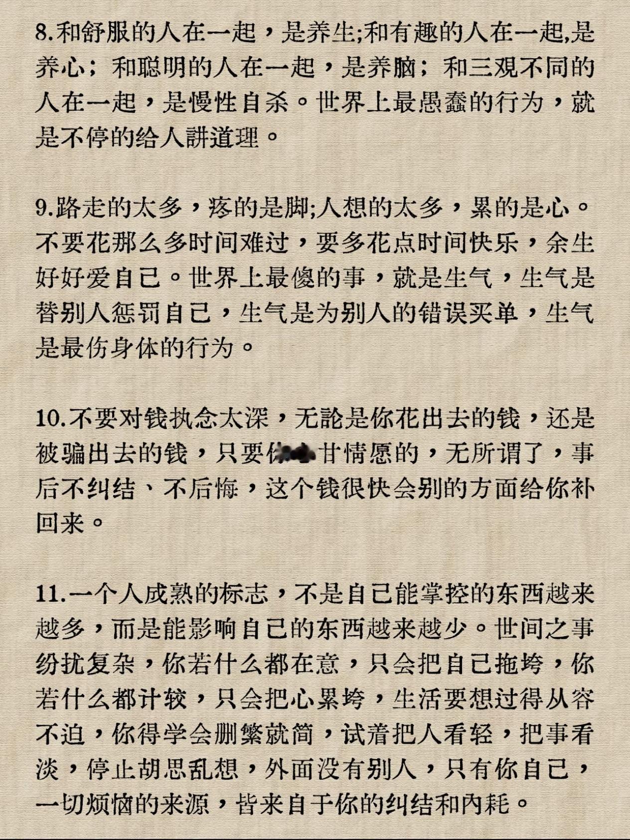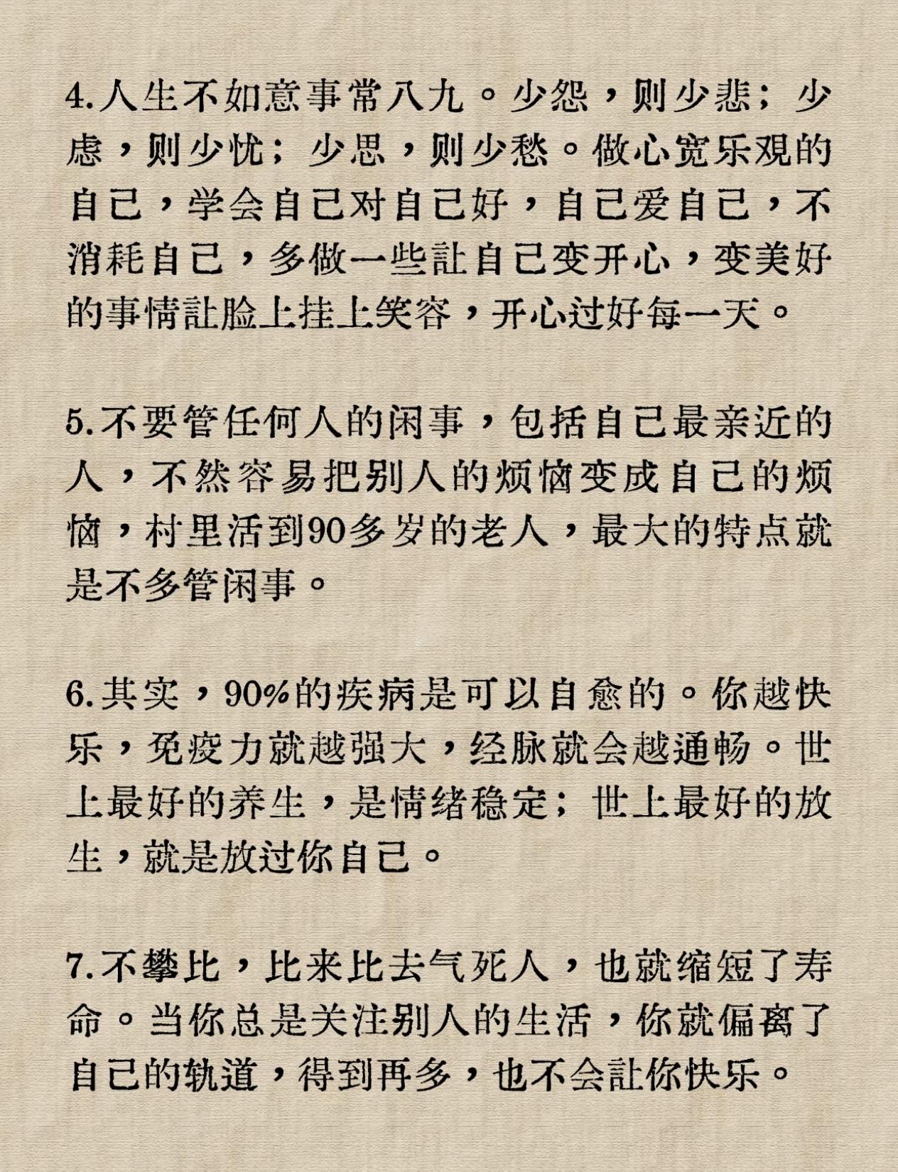 人到中年最好的养生办法是啥? 人生没有十全十美,十有八九都会遇到烦心事,这需要自己去排解,去释放,只有活的更久才能看到未来的曙光。 普通人没有鹿鼎记中韦小宝的好命,左右逢源妻妾成群,记者采访金庸老先生时问过一句话。 现实生活中,真的韦小宝的原型吗?金庸老先生回答:有。 作为普通人,要让自己保持开心的状态,困难都会迎刃而解。 11条中年人养生方法,相信对于你以后会有很大帮助。 收藏转发起来吧![祝福]九条养生小技巧 中老年养生方法 顶级养生方法 老年人养生秘诀 民间养生小窍门
