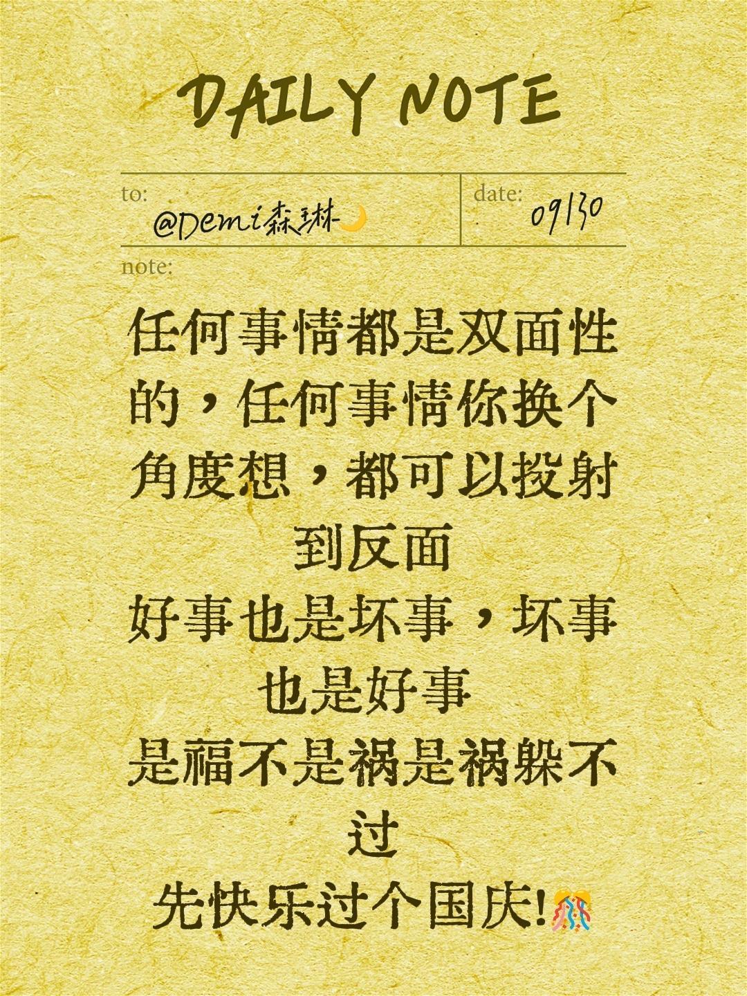 任何事情都是双面性的,任何事情你换个角度想,都可以投射到反面 好事也是坏事,坏事也是好事 是福不是祸是祸躲不过 先快乐过个国庆!🎊