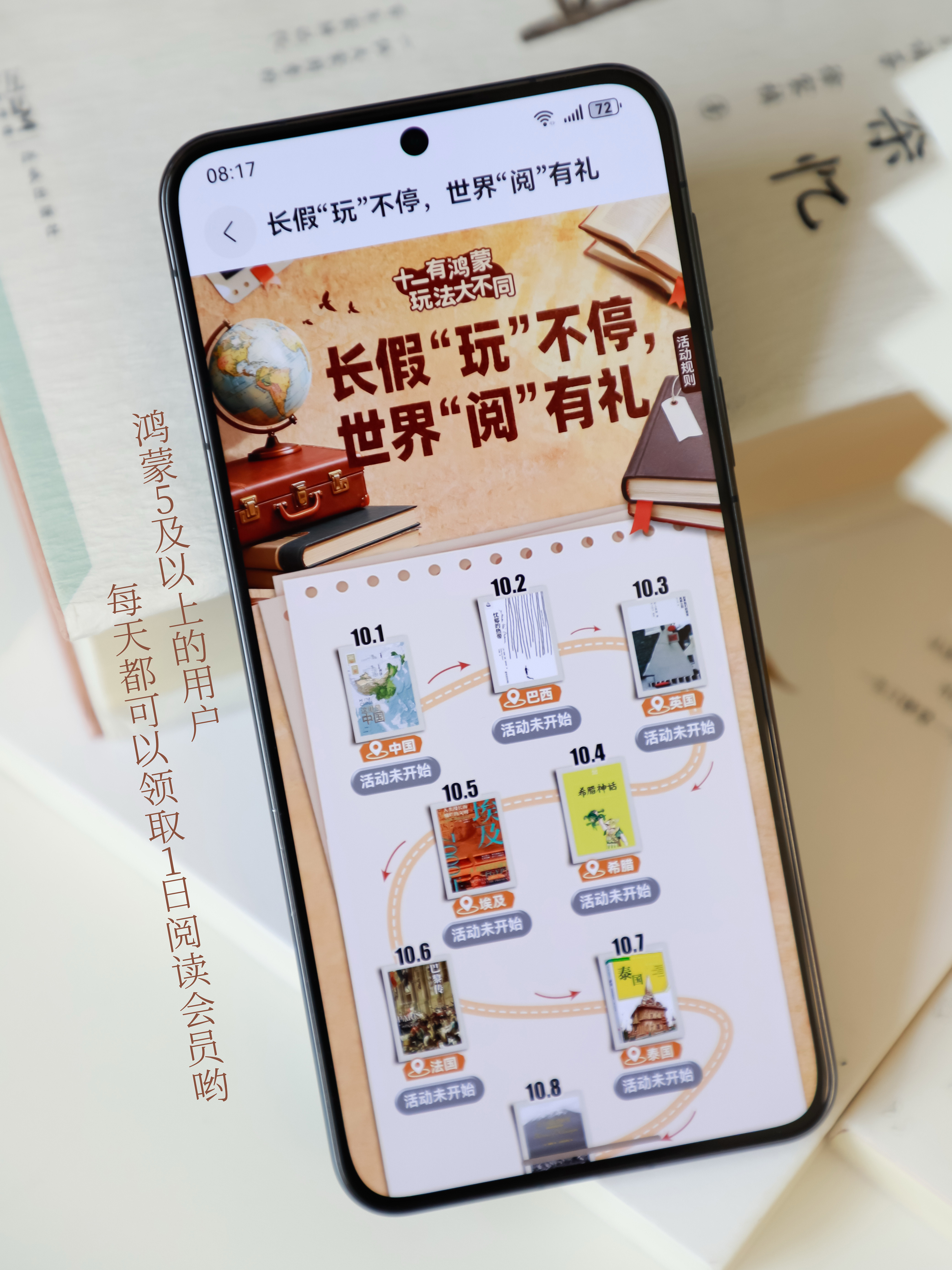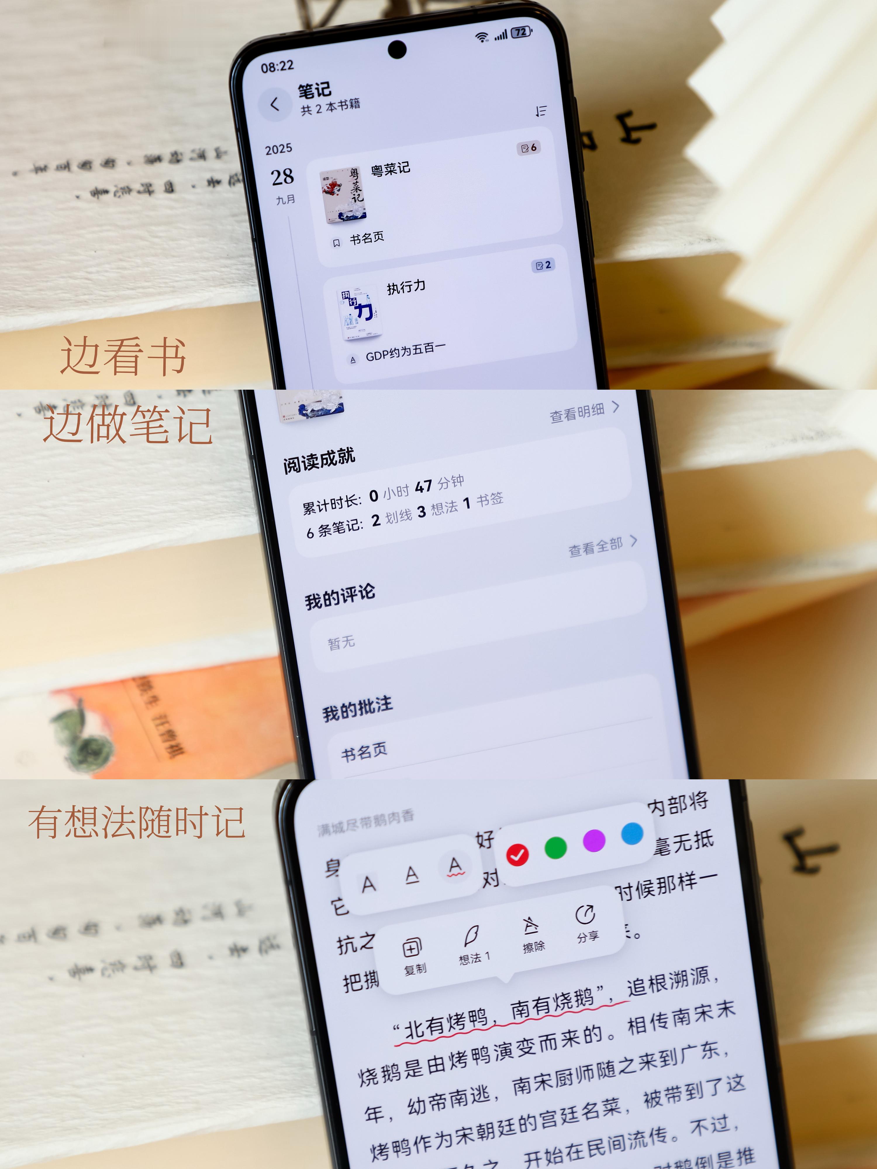 话说回来,提起我平时看书用到的华为阅读,我真的忍不住要和你们好好夸一下啦哈哈哈,因为实在是太方便啦!平时不管是看小说还是学习或者是像今天这样通过游记查攻略,华为阅读真的是占据了我生活中的方方面面~习惯了这种阅读式的生活,感觉自己整个人都能静下心来,所以,真的不要再整天去刷短剧啦!多读书吧!而且华为阅读很多功能都很贴心艾,不仅可以看书、听书,还有AI眼动翻页功能,一个眼神就能翻页,真的是解放双手呀,坐车的时候我可以边看书边吃零食手眼各忙各的嘻嘻嘻,这功能真太香啦~还有哟,最近更新之后,还增加了阅读成就、我的笔记、书单收藏等等一些新功能,让我的看书之旅更加丰富多彩啦嘻嘻嘻~我最最喜欢的就是我的笔记功能,可以边看书边做笔记,可以用“划线”和“想法”标记,比如我现在看的这本《粤菜记》,看到有想吃的美食我就标记一下,后面在我的-笔记里就能找到,时间线的形式排版一目了然,点击还可以回到原文的位置,超方便!真心建议你们快去试试哇,绝对的入股不亏哟~这不刚好鸿蒙5用户在华为阅读参与国庆活动,每天都能领取阅读会员,走过路过不要错过呀!