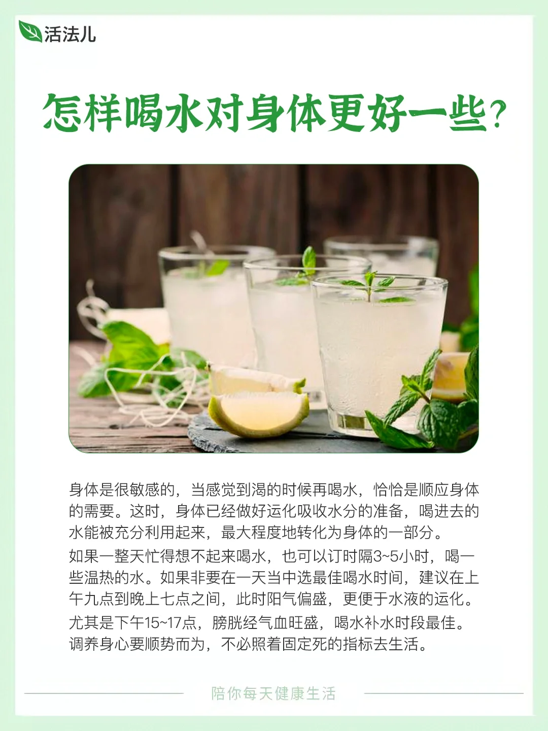 🍃如果非要在一天当中选最佳喝水时间,建议在上午九点到晚上七点之间,此时阳气偏盛,更便于水液的运化。尤其是下午15~17点,膀胱经气血旺盛,喝水补水时段最佳。