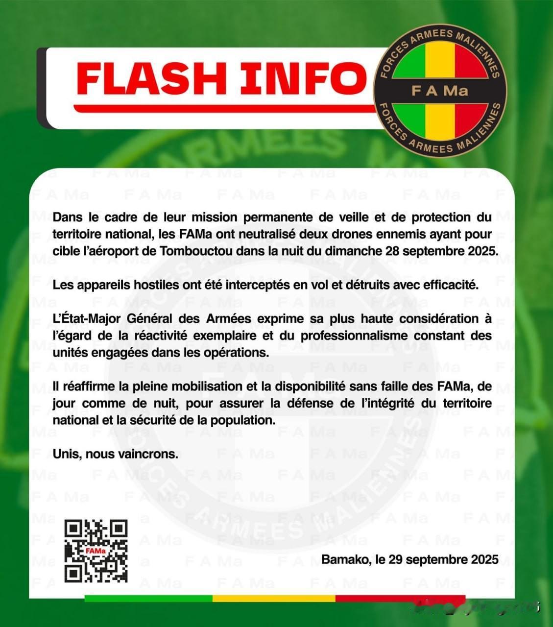 🇲🇱马里武装部队摧毁两架飞往廷巴克图机场的无人机 9月28日夜间,马里武