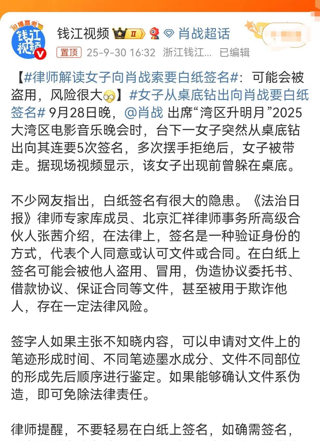 这女的莫非是来坑肖战的吗? 近日,一女子从桌底钻出要肖战在白纸上签名。 肖战多次拒绝,女子最终被带走。 律师说不要轻易在白纸上签字,风险很大。 这个女的绝对是有目的的。 不知道她想利用这个签名干什么? 幸亏没有签,肖战防范意识还是挺强的。
