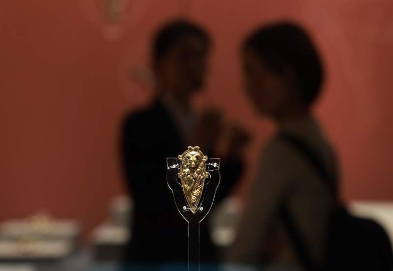 “这件金当卢非常精致,保存也十分完整。”北京大葆台遗址博物馆讲解员向记者介绍,当卢是安在马额头正前方的一种装备,在古代,当卢就起到豪车车标的作用,这种错金银工艺雕刻精美的金当卢,彰显着主人尊贵的身份。当卢也具备实用性功能,安在额头正前方,可以保护马的额头不受撞击,此外雕刻成熊的形状,寓意勇猛,也有辟邪祈福的寄托。