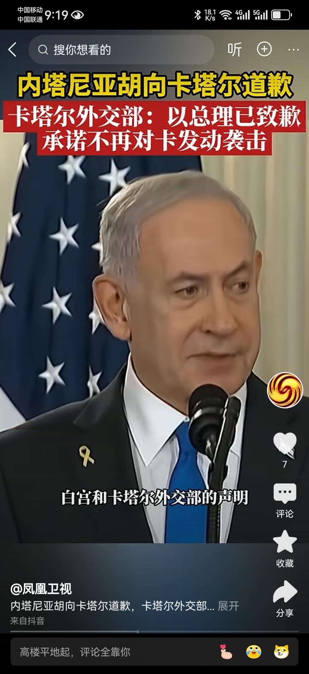 承认了,但他一点诚意都没有。内塔尼亚胡向卡塔尔道歉,并承诺不会对卡塔尔发动袭击,