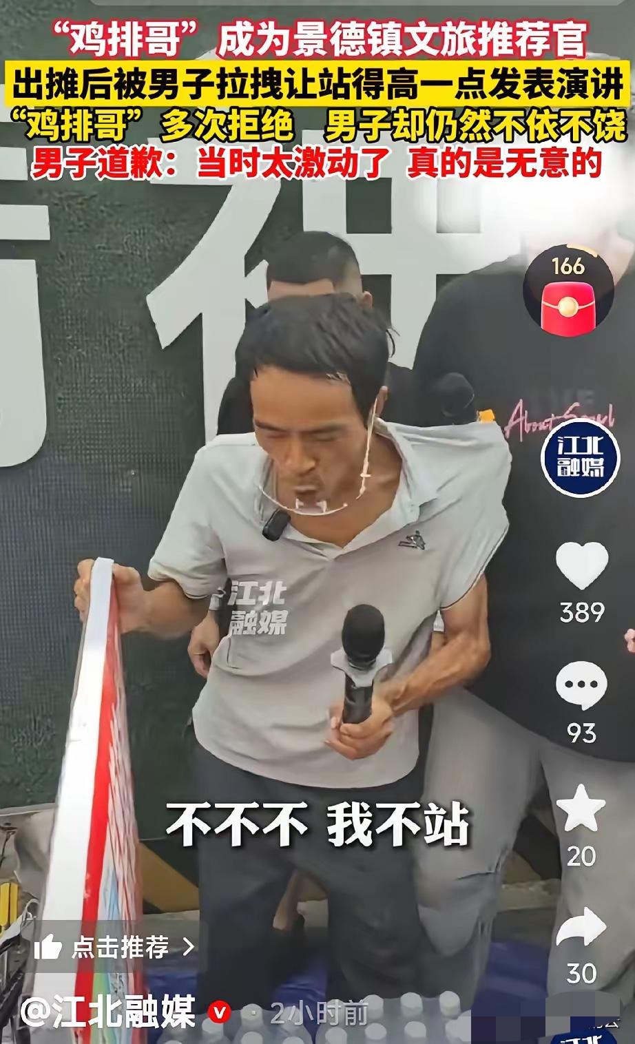 这个男人的举动让人反感。 鸡排哥火了后,来看他的粉丝把现场堵的水泄不通。鸡排哥总能游刃有余的面对。 可这件事让鸡排哥难堪了。事情是这样的,一个黑衣男子非要拉着鸡排哥让他站在水上给粉丝演讲。被鸡排哥拒绝了。 因为大家都知道,鸡排哥的主业是炸鸡排,人家要工作,而不是火了去演讲。还有鸡排哥和粉丝的互动更有趣。所以鸡排哥明确的摆手拒绝。 谁知黑衣男子却不依不饶,直接上手扯着鸡排哥的衣服,要拉他上去演讲。鸡排哥明显不高兴,都黑脸了,可那个人还一直在拉扯他的衣服。 直到旁边人解围说,不愿意别让他上了。黑衣男子才罢休。 黑衣男子这一扯,扯掉的不只是鸡排哥的衣服,更是“尊重”二字。鸡排哥火起来,靠的不是什么华丽的人设,就是炸鸡排时的实在、和粉丝互动时的接地气。粉丝愿意围着他,是因为喜欢这种烟火气——看他炸鸡排的熟练动作,听他和大家插科打诨的闲聊,这种不刻意的亲近,才是他受欢迎的原因。可这个黑衣男子,非要把鸡排哥拉到水上演讲台,逼着他做不喜欢的事,这哪里是支持,分明是把自己的意愿强加给别人,用为你好的名义,行绑架之实。 鸡排哥的拒绝,其实已经说得够明白:他的主业是炸鸡排,要工作,不想演讲。换成任何一个普通人,被人在工作时强行拉着做无关的事,都会不高兴,更何况是被直接上手拉扯衣服。黑衣男子眼里,可能觉得让你演讲是给你面子、火了就该配合大家,却忘了哪怕是流量加持的网红,也有说不的权利。他把自己当成了粉丝代表,却忽略了最基本的边界感——喜欢一个人,不是要把他变成自己想要的样子,而是尊重他本来的选择。 更让人不舒服的是上手拉扯这个动作。鸡排哥已经明确摆手拒绝,甚至黑脸表达不悦,可黑衣男子依旧不依不饶,伸手去扯衣服,这已经超出了热情的范畴,变成了冒犯。现场那么多粉丝看着,鸡排哥既要顾及形象,又要维护自己的底线,那种尴尬和无奈,隔着屏幕都能感受到。这种打着支持旗号的强迫,比直白的恶意更让人难受——它让被冒犯者陷入不配合就是耍大牌的舆论困境,也让周围的人看得别扭。 说到底,鸡排哥不是舞台上的明星,而是炸鸡排的摊主。他的火,是因为大家在他身上看到了普通人认真生活的样子,看到了不装不作的真实。可有些人为了满足自己的参与感,非要把他推上不属于他的舞台,逼着他走商业化的路子,这其实是在毁掉大家最初喜欢他的理由。就像有人喜欢一家路边摊的味道,却非要逼着老板开连锁、搞加盟,忘了老板只想安安稳稳做好每一份小吃。 这件事也给所有喜欢网红、素人明星的人提了个醒:流量不是绑架他人的工具,喜欢更不该成为冒犯的借口。不管是谁,哪怕再受欢迎,也有自己的生活和工作,有不想做的事、不愿触碰的边界。真正的支持,是远远看着他做好自己的事,在他需要的时候不添乱,而不是打着为你好的旗号,逼着他活成你想要的样子。 希望这个黑衣男子能明白,他的举动不是帮鸡排哥,而是给对方添堵;也希望更多人能记住,尊重他人的意愿,守住与人相处的边界,才是对喜欢的人最好的温柔。 各位读者你们怎么看?欢迎在评论区讨论。 鸡排达人 景德镇鸡排哥
