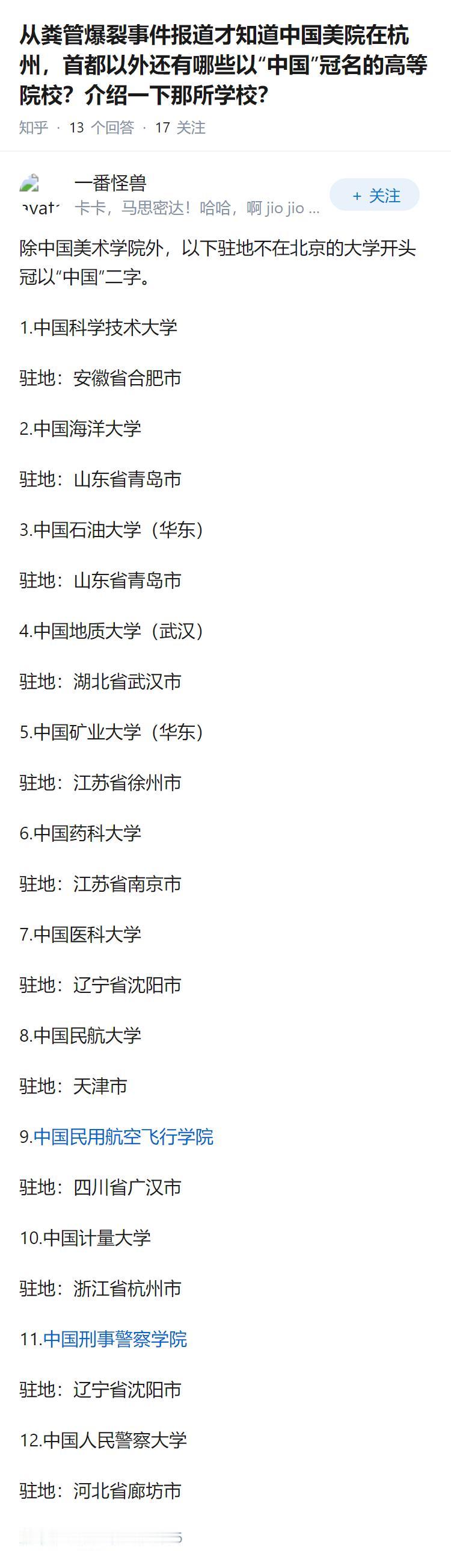 从粪管爆裂事件报道才知道中国美院在杭州,首都以外还有哪些以“中国”冠名的高等院校?介绍一下那所学校?