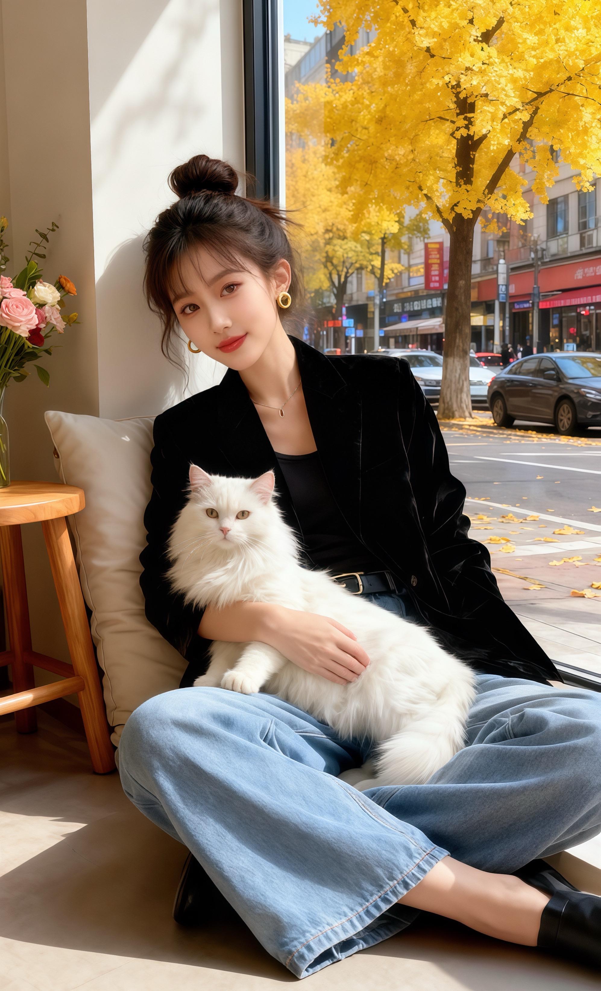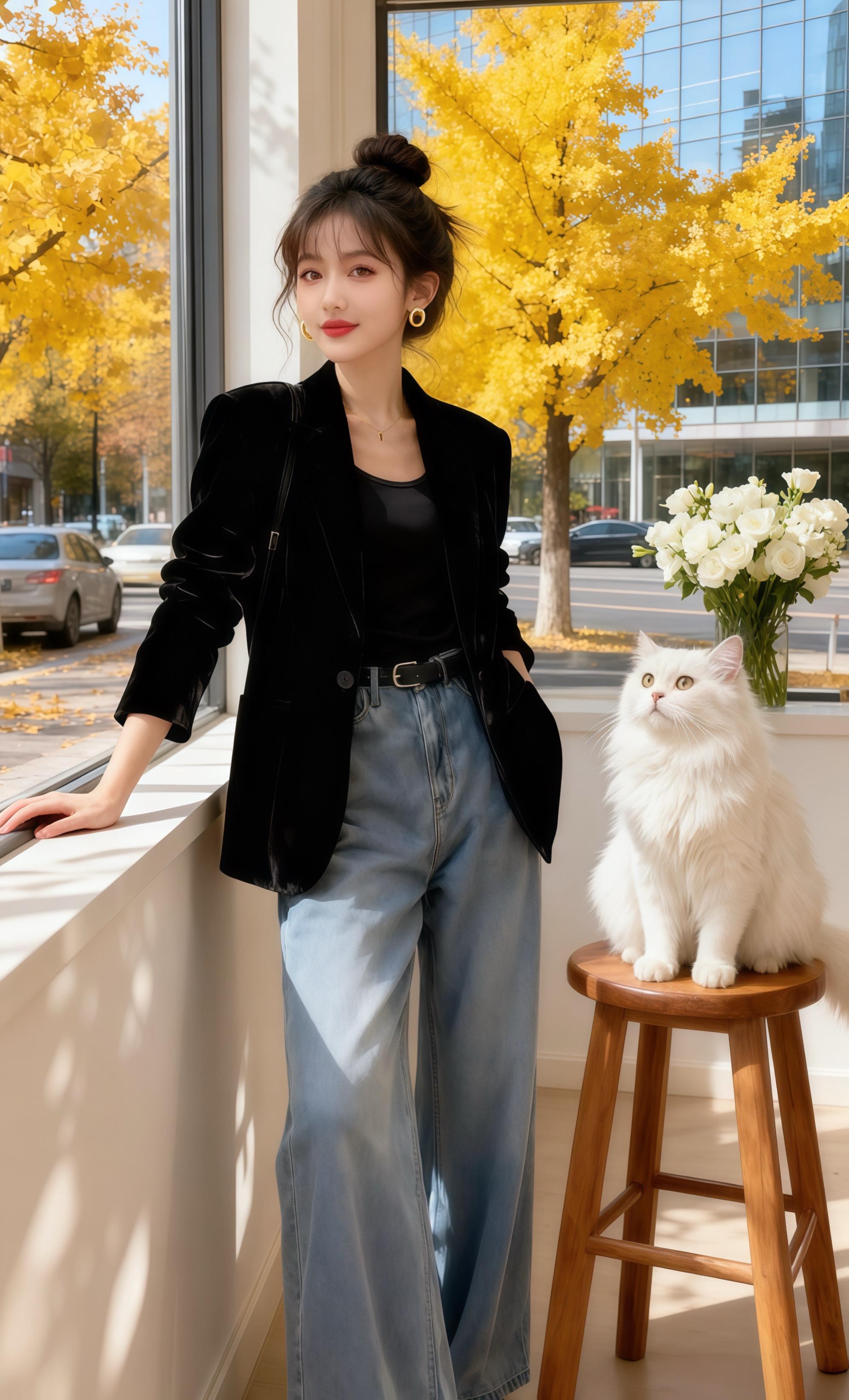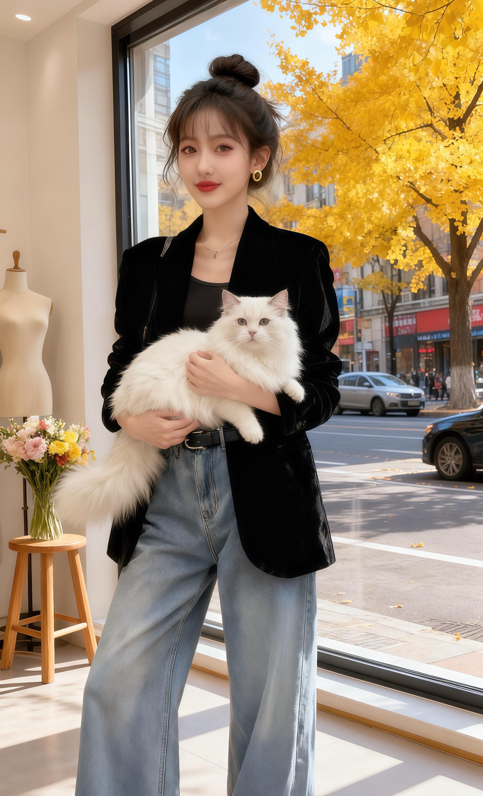 她靠在窗边,看街上车水马龙,看银杏叶打着旋儿飘落。这套穿搭是她的心头好,丝绒的复古与牛仔的随性碰撞,就像她的小店,在都市喧嚣里守着一处温柔