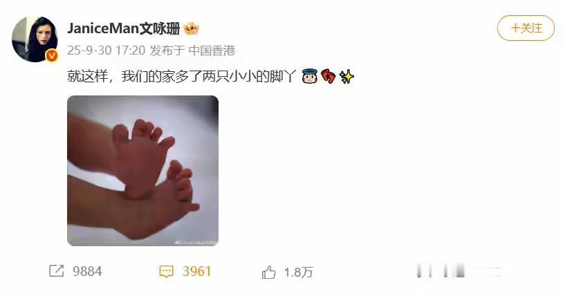 9月30日,36岁的文咏珊在个人社媒晒出婴儿脚丫照,官宣产子,配文“我们的家多了