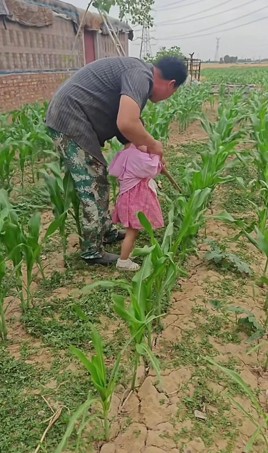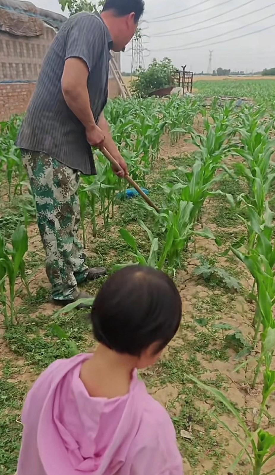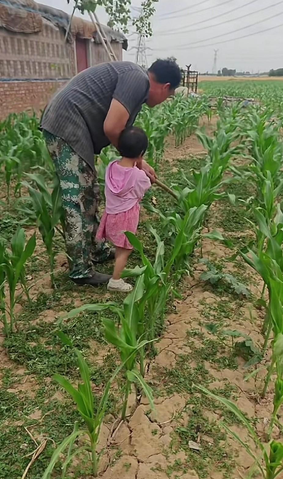 小满儿和爸爸同耕在田野间,满宝小小的身躯和绿色的玉米苗一样,满爸一同呵护在心间。