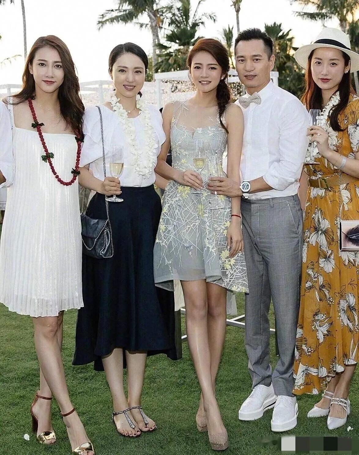 画面中的安以轩香肩裸露,娇柔腰柳,玉指如葱,但满面沧桑;身着白裙的弦子秀发飘逸,项链别致,珠光玉色;白衣黑裙的董璇气色盈和,樱唇榴齿,鞋子与红色脚趾抢镜;最右侧那位穿长裙背坤包的美女是谁?