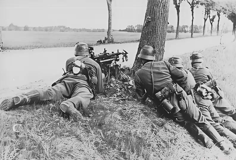 这张图片是二战时期入侵苏联的德国步兵们正在用机枪封锁道路,这一群德国军人用一挺机