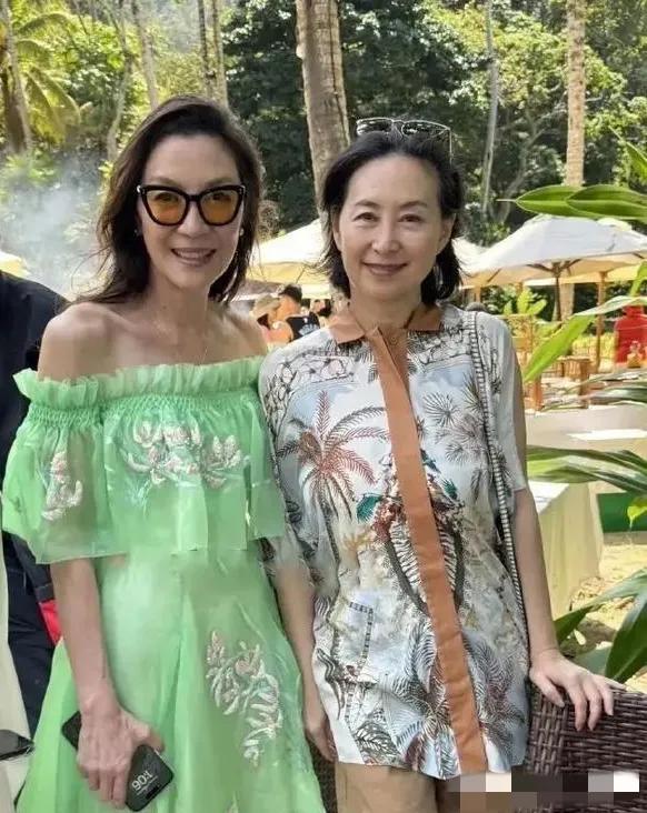 画面中已过耳顺之年的杨紫琼长发披肩,瘦骨伶仃,身材平板,柳眉高挑,一袭绿色露肩纱裙配黑边茶色镜显得不伦不类哈! 一旁的何超琼龙眉凤目,金相玉质,清雅端丽,笑意粲然,气质甜美,温婉如莲,看来明星与豪门同框不论是颜值衣品还是气场风度永远占下风呀,你看呢?