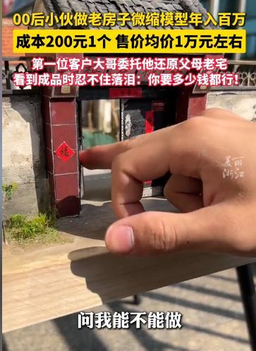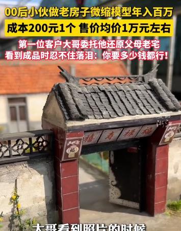 成本200,售价一万!这是什么生意,一本万利?浙江一名00后小伙子,用微缩模型复刻老房子,年收入百万。 杭州转塘的老厂房里,22岁的林深刚把最后一块微型榫卯构件卡进门楼。 在城市化的浪潮里,老房子拆得比翻书还快,无数人对着旧照片怀念家乡。 而这个00后小伙,偏偏把这份无处安放的乡愁,做成了看得见摸得着的生意。 林深的创业路,是被半块雕花窗楣“砸”出来的。 2021年老家拆迁,他在废墟里捡到半块带着雕花的旧窗棂,上面的图案已经模糊。 为了复原纹样,他翻遍故宫建筑资料,还自费跑到苏州园林测绘,硬生生对着残片刻了一个月。 做好的窗楣模型挂到网上,没想到立刻被一位台湾藏家以1.2万元买下,对方说,这和我爷爷家的窗棂一模一样。 这件事让他突然明白,自己刻的不是木头,是别人拿命珍藏的回忆。 他干脆从技校木雕专业毕业后,在老厂房里租了间工作室,专门做老房子复刻。 刚开始最难的是还原真实感,比例失调、做旧效果假都是常事。 为了复刻一座民国老宅,他拿着卷尺在老街区蹲了三天,测量每根房梁的粗细,记录砖瓦的排列规律,连墙角的青苔分布都拍了百张照片。 工作室墙角堆着37座拆解的模型残骸,都是他练手时的失败品。 现在他的手艺早已炉火纯青。做一座30:1比例的老宅模型,光瓦片就得手工雕刻上万次,房梁上的雕花要用细针一点点勾出来,甚至能还原出老墙上孩子乱涂的粉笔印。 有位杭州大哥带着一张褪色的老照片找来,说父母的老房拆了十年,想留个念想。 三个月后模型做好,大哥看到院角那棵微型老槐树,当场红了眼,我小时候就在这树下偷摘枇杷,连树干的弯度都一样。 有人总问“凭啥卖这么贵”,林深在直播间里直接拆过模型,露出里面1287个独立构件。 这些榫卯结构每根都能单独取下,是老祖宗传下来的手艺。 更关键的是藏在模型里的情感价值。 他的客户里,68%是25到35岁的都市白领,有人买给老家的长辈当礼物,有人把模型摆在办公室缓解思乡之苦。 甚至宁波有座村史馆专门找他定制了10座老宅模型,用来展示当地的历史变迁。 这门生意早就不是单打独斗了。 林深组建了8人的团队,还签约了几位非遗匠人。 他们没守着老手艺故步自封,反而引入3D扫描技术,把老房子的细节转化成数字模型,再结合传统木工手艺制作,效率提高了却没丢了温度。 他还开发了“老宅盲盒”,让年轻人在拼搭中了解古建筑美学,直播间单场观看量常破8万。 如今林深的订单已经排到了半年后,他正忙着做“消失的杭州”系列模型,想把那些拆了的老街区都留在方寸之间。 他常说自己不是生意人,是“情感传递者”。 在这个快节奏的时代,太多人追逐立竿见影的快钱,可林深们用行动证明,沉下心做手艺,把爱好藏进细节,让传统接上时代,反而能走出一条更稳的路。 信息来源:美丽浙江2025-09-27发布