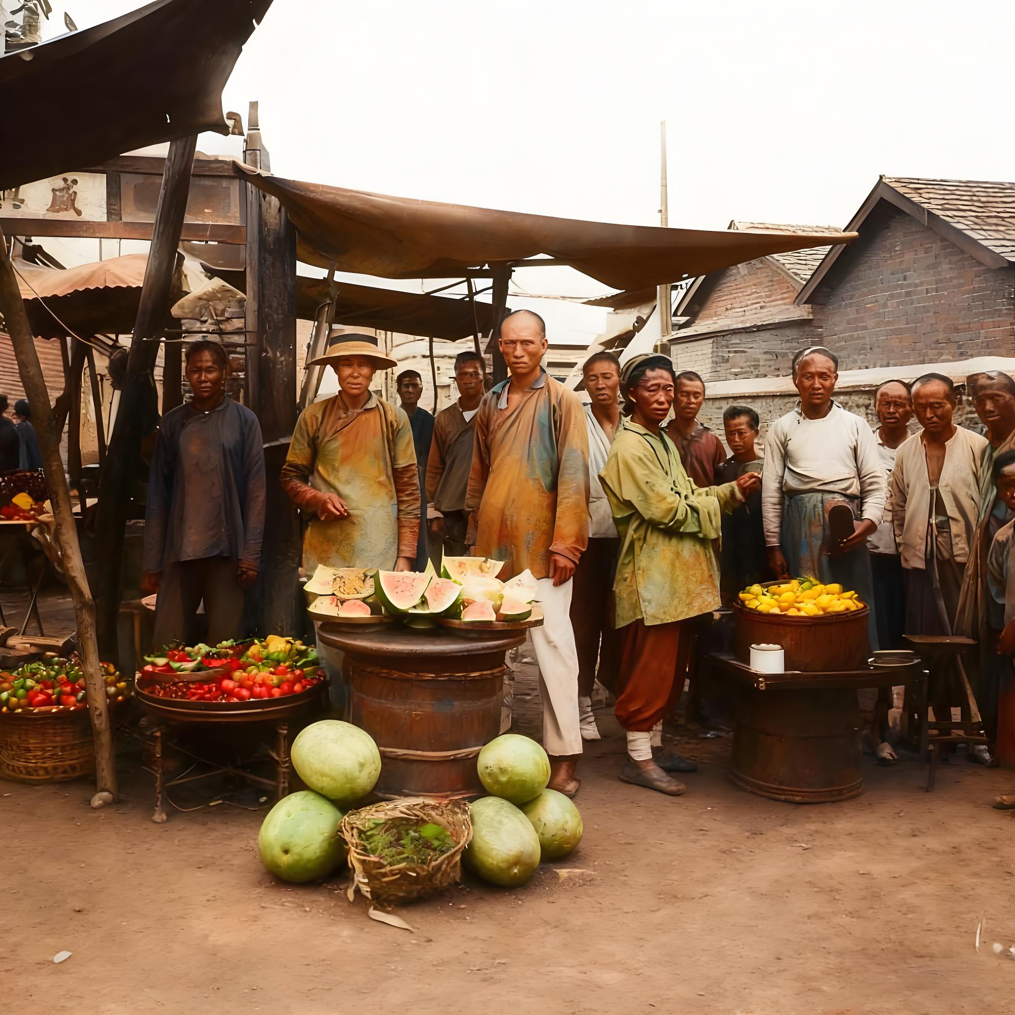 这张百年前的街头市集照片,像一段被凝固的时光,将清末男性摊贩的群像真切地呈现在眼前。 镜头里挤满了从老到幼的男子,没有女性身影,他们或站在瓜果摊前,或围在杂货担旁,面对镜头时都带着明显的局促感——有的眼神闪躲,有的身体僵硬,仿佛对这“摄魂”的机器充满陌生与不安。