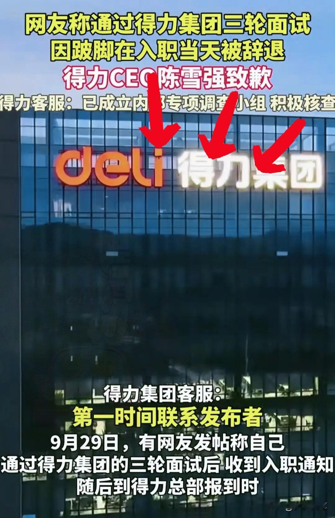 果然事教人,一教就会, 得力集团道歉了, 但他们并不是知道自己错了,得力只是怕自己的饭碗不保。 过了四轮面试的员工,只因走路跛脚就被火速辞退,还逼着人家主动离职。 现在眼看舆论炸锅,才发声明表态度,哪里是反省过错,分明是怕口碑崩盘丢了市场! 都说大企业要有大格局,真正的尊重从来不是写在宣传册里的漂亮话。那些愿意给特殊群体平等机会的公司,哪怕名气不大,也让人打心底佩服。 反观得力,用冰冷的辞退击碎求职者的期待,再用程式化的道歉应付公众,满满的套路里,唯独看不见半点真诚。 这种迫于压力的道歉,到底能不能挽回企业形象?如果是你遭遇职场歧视,会选择默默忍受还是坚决维权?