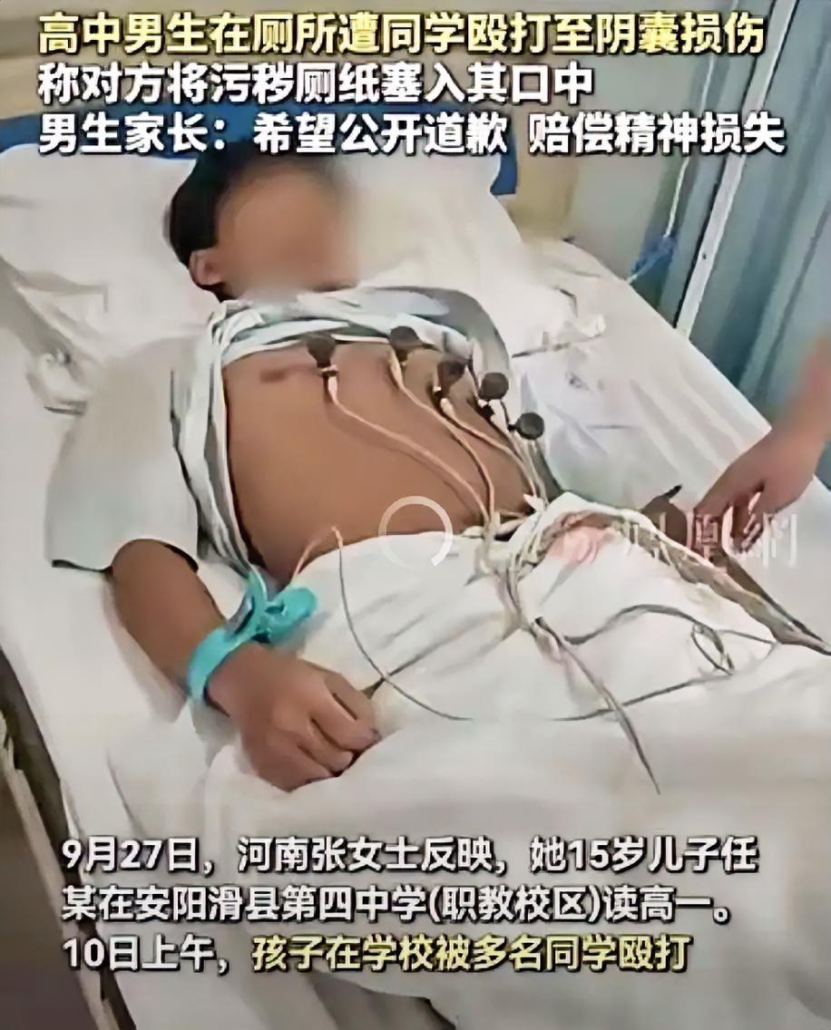 河南安阳,高一男生晚上想睡觉,可对门的宿舍还在吵,他就喊了一声,让他们不要吵了,结果第二天,他们把男生叫到厕所,十几个学生前后夹击男生,男生被打得满嘴流血,他们还将一团带着屎尿的厕纸塞到他嘴里。 你敢信吗?就因为一句“别吵了”,一个想好好睡觉的孩子,愣是被拖进厕所遭了这种罪。高一啊,本该是坐在教室里算函数、偷偷在课本上画小人的年纪,怎么就有人能对同龄人下这么狠的手?满嘴流血还不够,居然拿带屎尿的厕纸塞嘴——这哪是学生间的打闹,分明是带着恶意的侮辱,是把人往绝境里逼。 我特意想了想,那男生喊出声的时候,大概率没多想。可能就是揉着惺忪的眼睛,对着门缝含糊说了一句,心里只盼着能清净点,明天早自习别犯困。他怎么会料到,这句再正常不过的提醒,会变成第二天厕所里的“鸿门宴”?十几个学生前后夹击,他一个人怎么反抗?估计当时腿都吓软了,可再怕也躲不过拳头,躲不过那团让人作呕的厕纸。 更让人窝火的是,这事儿发生在学校里啊!宿舍晚上吵得没人管,第二天学生被拉去厕所霸凌,也没个老师或宿管撞见?难道学校的管理就松到这个地步?学生的安全、人格尊严,在某些地方是不是成了没人管的“小事”?要是当天有人能及时站出来,那男生也不至于受这么大的委屈,也不至于留下一辈子都抹不去的阴影。 那些打人的学生,难道就没想想后果?他们下手的时候,看着男生满嘴是血,心里就没一点怵?还是说,拉帮结派的“威风”,早就盖过了基本的良知?可能他们觉得,这只是“教训”一下多管闲事的人,可这种带着侮辱性的暴力,早已经触犯了底线——不仅伤了人的身体,更碎了人的自尊,这种伤害,比身上的伤口难愈合多了。 还有男生的家长,知道消息的时候得多崩溃?送孩子去学校是为了读书、长本事,结果却在厕所里被人这么欺负。估计连夜赶去学校的时候,手都是抖的,看着孩子肿着的脸、不敢说话的样子,心里的火和疼能烧得睡不着觉。他们找学校要说法的时候,得到的是敷衍还是真正的重视?这事儿要是处理不好,孩子以后还敢相信学校吗? 校园里的恶,从来都不是“小孩子不懂事”能搪塞的。今天能因为“吵到睡觉”就动手打人、侮辱人,明天会不会因为更一点小事就闹出更大的乱子?学校得拿出真办法来,不光要惩罚施暴者,更要教所有学生:暴力解决不了问题,欺负别人不是能耐,尊重和善良才是该学的第一课。不然,再多的校规校纪,也拦不住藏在厕所里的恶意。 各位读者你们怎么看?欢迎在评论区讨论。