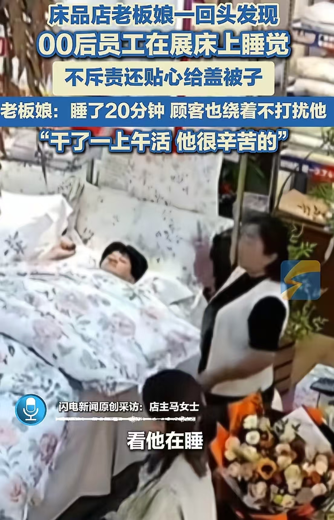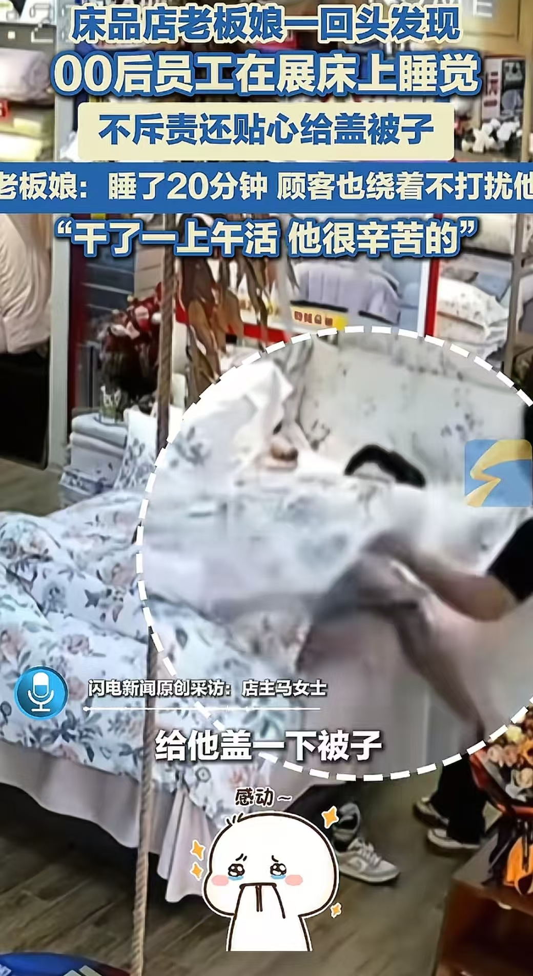 笑不活了!00后小伙去床品店上班,居然躺在展床上睡着了!老板娘发现后,一番举动令人暖心!网友:说明床品舒服,活广告!