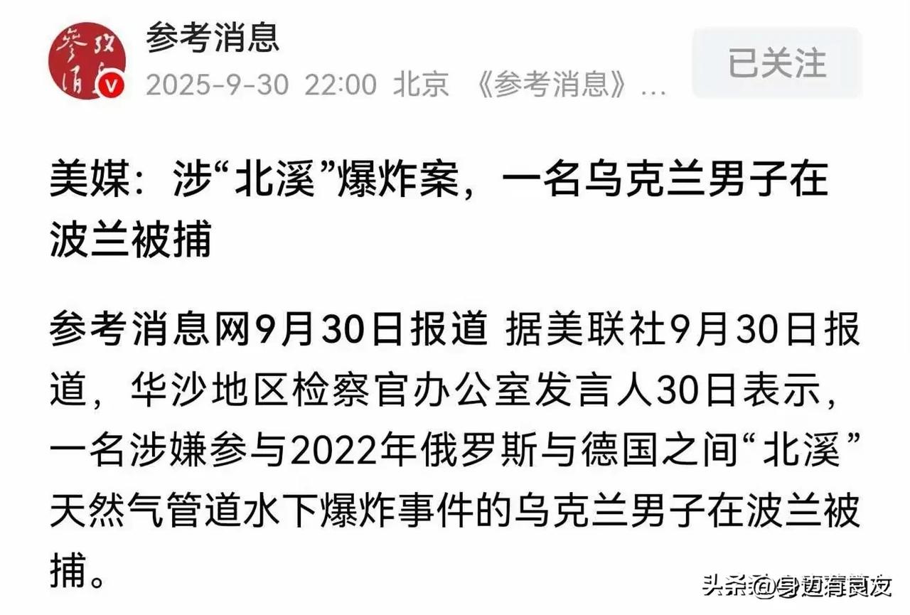 2. 北溪管道案第二名凶手在波兰落网:“北溪”管道案取得突破,继上个月组织者谢尔吉·K被捕后,第二名凶手弗拉基米尔·Z在波兰落网。他是爆破手,曾安放炸药炸破管道。7名乌克兰人伪装游客作案,致管道三根泄露、约50万吨天然气浪费。德国持续追查,将审讯弗拉基米尔·Z,真相或不久后揭晓。