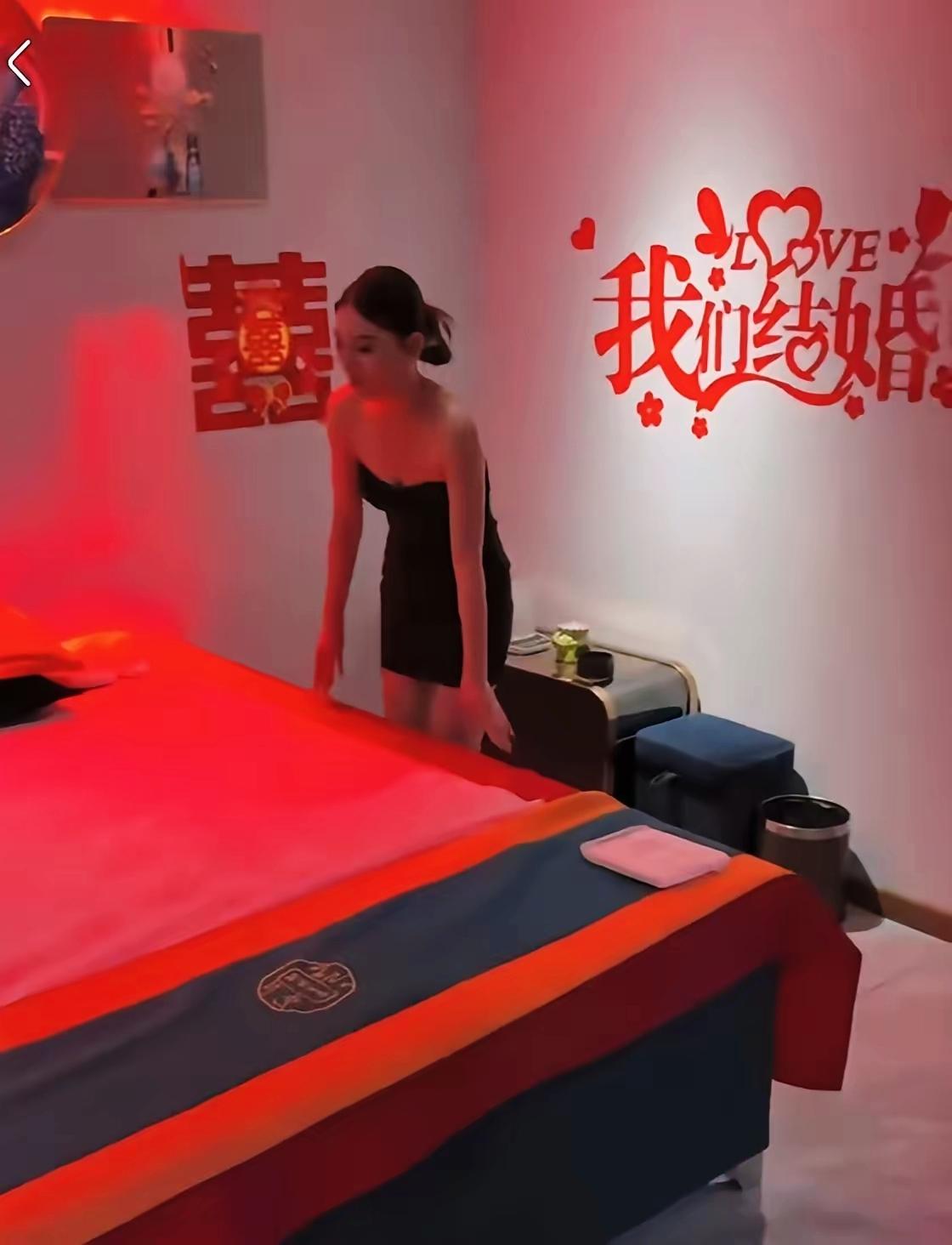 光看这两张照片, 谁不得以为是新人刚布置好的婚房? 可事实真能惊掉你下巴 这压根不是婚房, 就是家按摩店, 还真有人在这儿当起了“新郎”! 听在里面工作的朋友说, 这是家主打“婚房”主题的店, 能做足浴按摩、保健, 来晚了还能在这儿过夜。 说真的,一家按摩店装成这样, 只能说现在人脑洞太开了, 但这算啥突破啊? 更让人纳闷的是, 店里对工作人员要求特高, 得五官端正,身高至少一米六, 体重还不能超150斤。