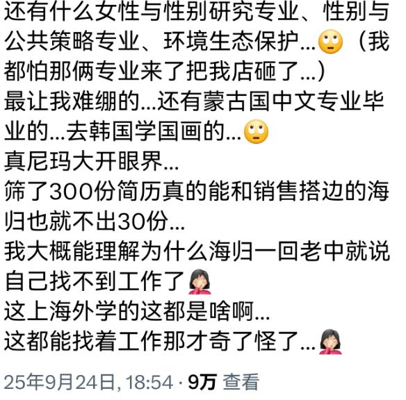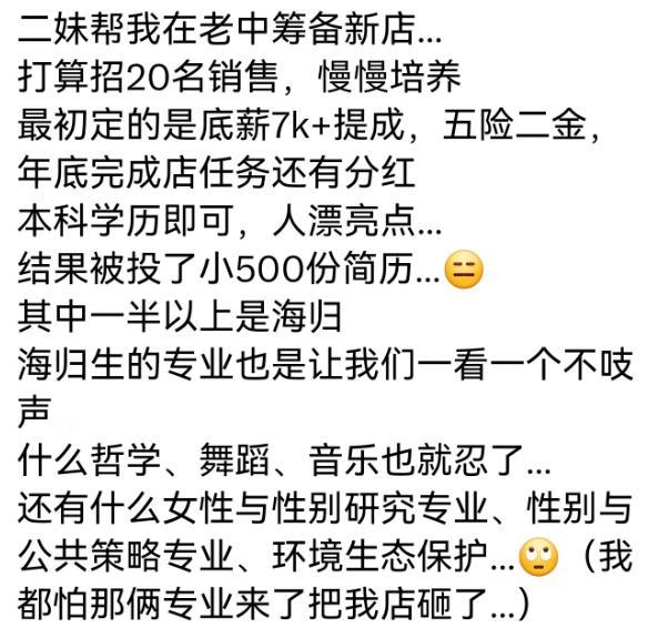 海归回来找不到工作? 你去外蒙古学习中文专业,你去韩国学国画专业,请问你能学到啥?还有什么哲学、舞蹈、音乐专业就算了,最关键的是,女性与性别研究专业、性别与公共策略专业,环境生态保护专业,请问海归学了这些专业,是什么目的,还有什么意义,能找得着工作才怪了吧? 真正学有所成的海归派,那都是各大公司疯抢的对象。但是学得好的留学生,基本上都在欧美国家就业了。能够回来的留学人才,确实少了那么一点,这个应该没有什么异议。尤其是学了一些不知所谓的专业,在国内根本没有就业市场。 就像博主在上文提到的那些专业一样,在国内哪里能用得到,你哪怕是考公务员,现在有很多岗位都不能报名。所以海归派才会一直说自己不好找工作,那也没办法,因为国内大学生就业,都不是那么好处理,这些所谓的海归派就更难了。 这些所谓的专业,都是没考上大学,出去学习的一些学生。本身高考的时候考不好,回来之后自然也不好就业。毕竟那些考上本科和研究生的毕业生,也得需要照顾。所以说海归派本身,家里就有钱,如果能自己解决就业,那是最好的,尽量不要给社会增添加负担,这样应该没问题吧? 目前国内的就业,还得是尽量留给国内的毕业生,海归派就委屈点,最好在国外就业。实在不行待不下去的话,回来之后没招了,那就只能待业了。