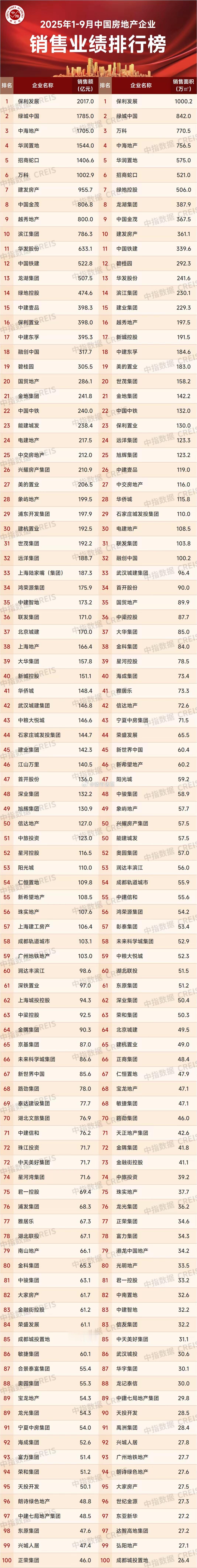 今年前9个月中国房地产企业销售业绩排行榜:保利、绿城、中海、华润和招商位居前五。