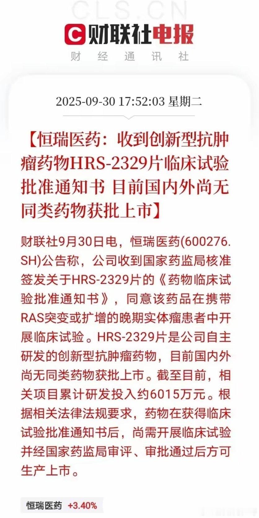 下午5点52分,恒瑞医药发布公告:公司收到药监局核准的创新性抗肿瘤药物HRS-2329片临床试验通知书,而且这在国内外尚无同类药物上市,该项目累计研发投入约6015万。这对恒瑞医药来说,既形成了产品技术壁垒,又巩固了自身市场地位,同时推动创新药市场无限想象空间。