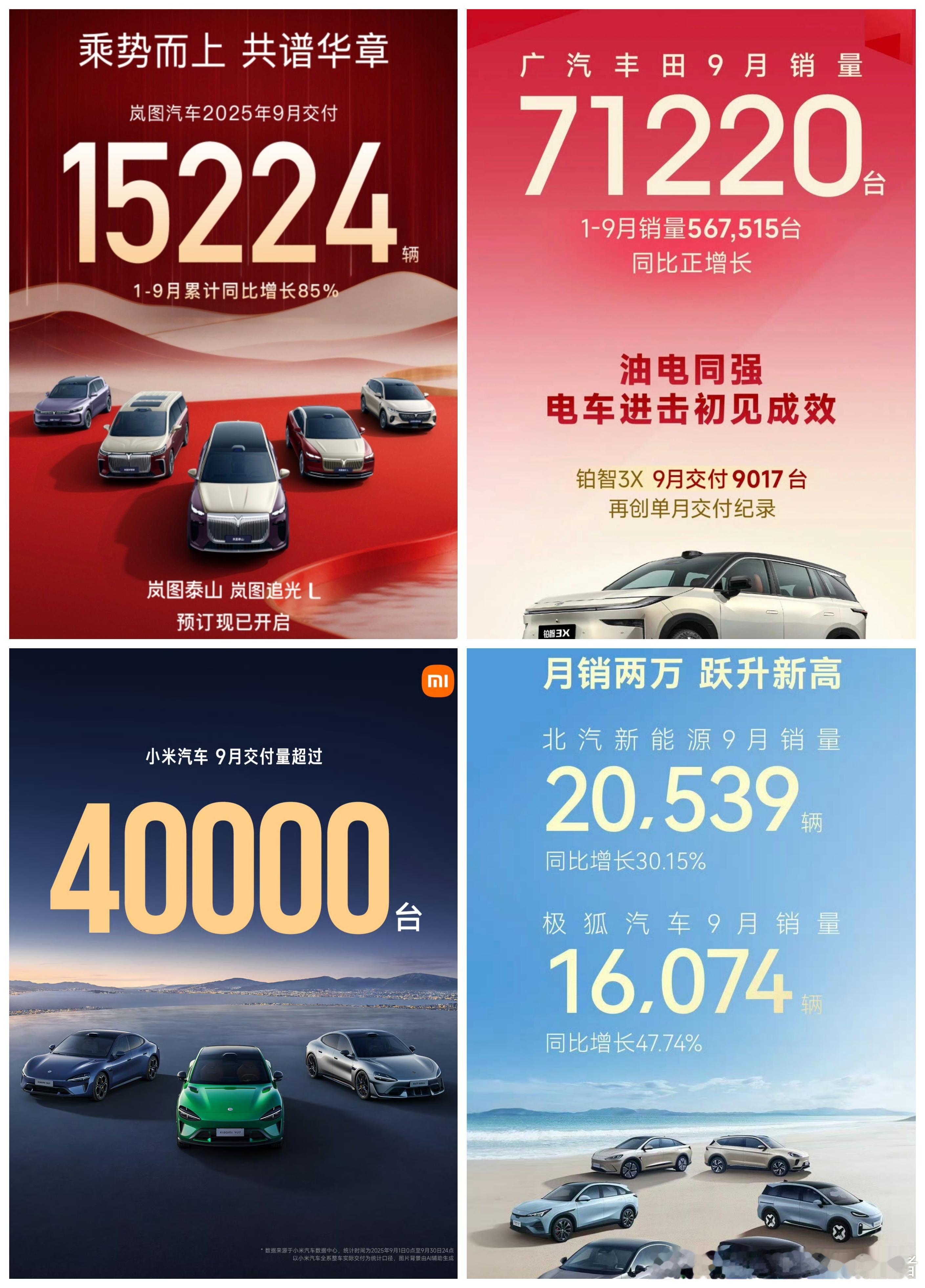 此外,岚图汽车9月交付15224辆,成绩也很优秀;北汽新能源9月交付20539辆新能源车;广汽丰田9月交付71220辆新车,基本盘还是稳定;极氪科技9月交付51159辆,同样很棒。