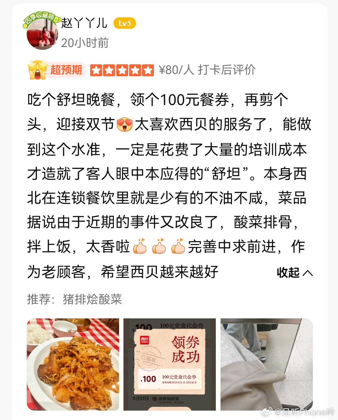 咋说呢,任意消费送无门槛100元的券,太有诱惑力。西贝再贵,俩人点200块,再减100,人均50。